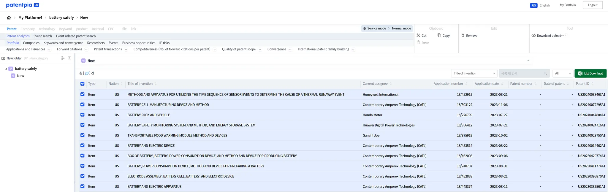 Event search services such as i) Search for patents used in litigation (enter 1 or more in the Patent Attribute->No. of litigations field), ii) Search for patents used in trials (enter 1 or more in the No. of judges field), and iii) Search for patents in transactions (enter 1 or more in the No. of assignments field) are provided, using a list of companies selected from My platform as search conditions in PatentPia Search. For more information about PatentPia Search'sevents occurrence patent search, please refer to [Link].