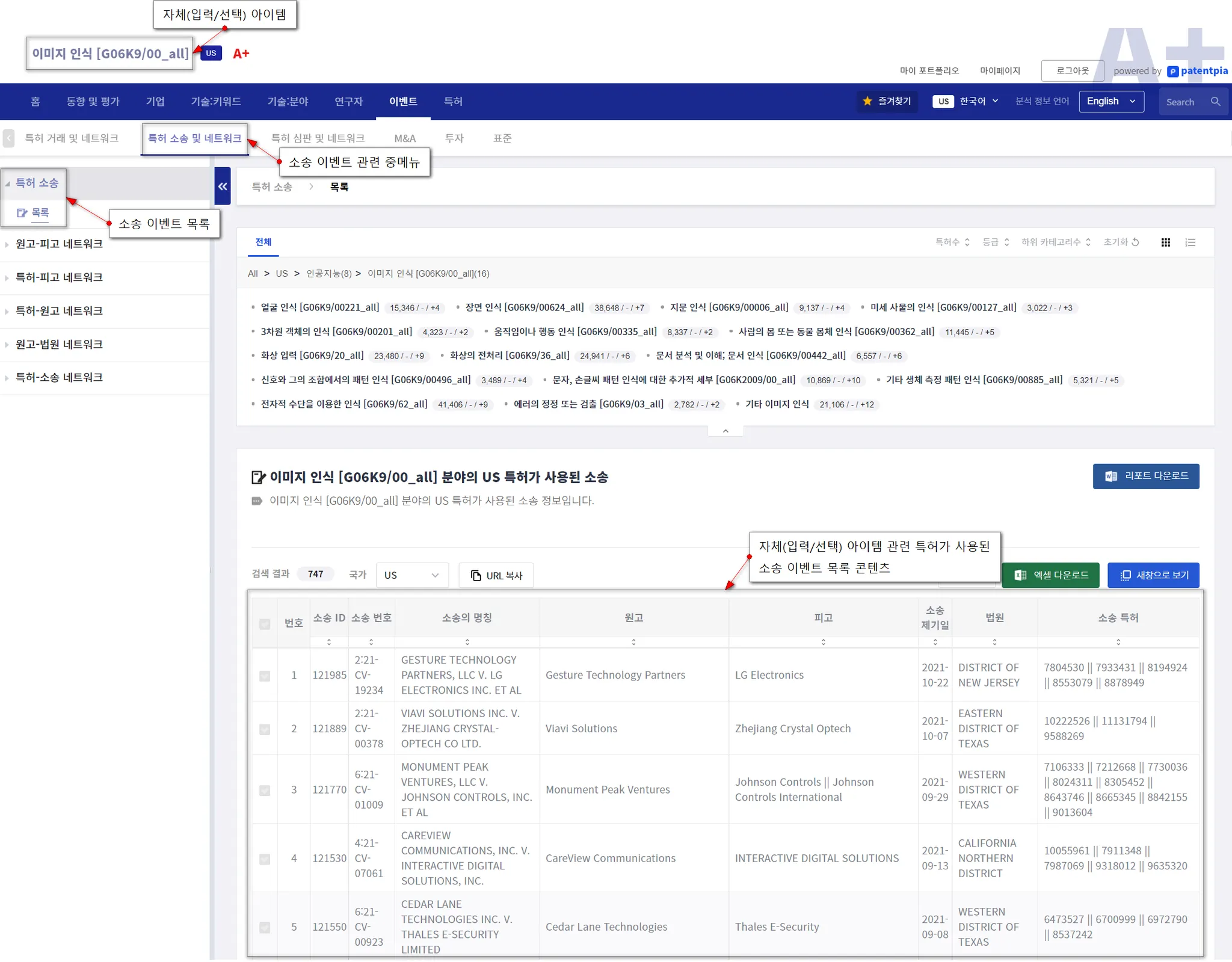 특허 관련 중요 이벤트에는  i) 특허 거래/매입/M&A를 통한 특허 이전, ii) 특허 소송/특허 심판 등의 거래, iv) 표준 특허, v) 특허가 사용된 FDA 승인, vi) 성과로서 특허가 창출된 국가 R&D 등이 있습니다. 분야에는 i) 기술 분야, ii) 키워드 분야, iii) 특허 분류(CPC/IPC 등), iv) 제품-부품 분야, v) 소재-물질 분야, vi) 컨셉 분야(coming soon) 등이 있습니다. 상세한 것은 아래의 “이벤트 종류” 항목을 참고하세요.