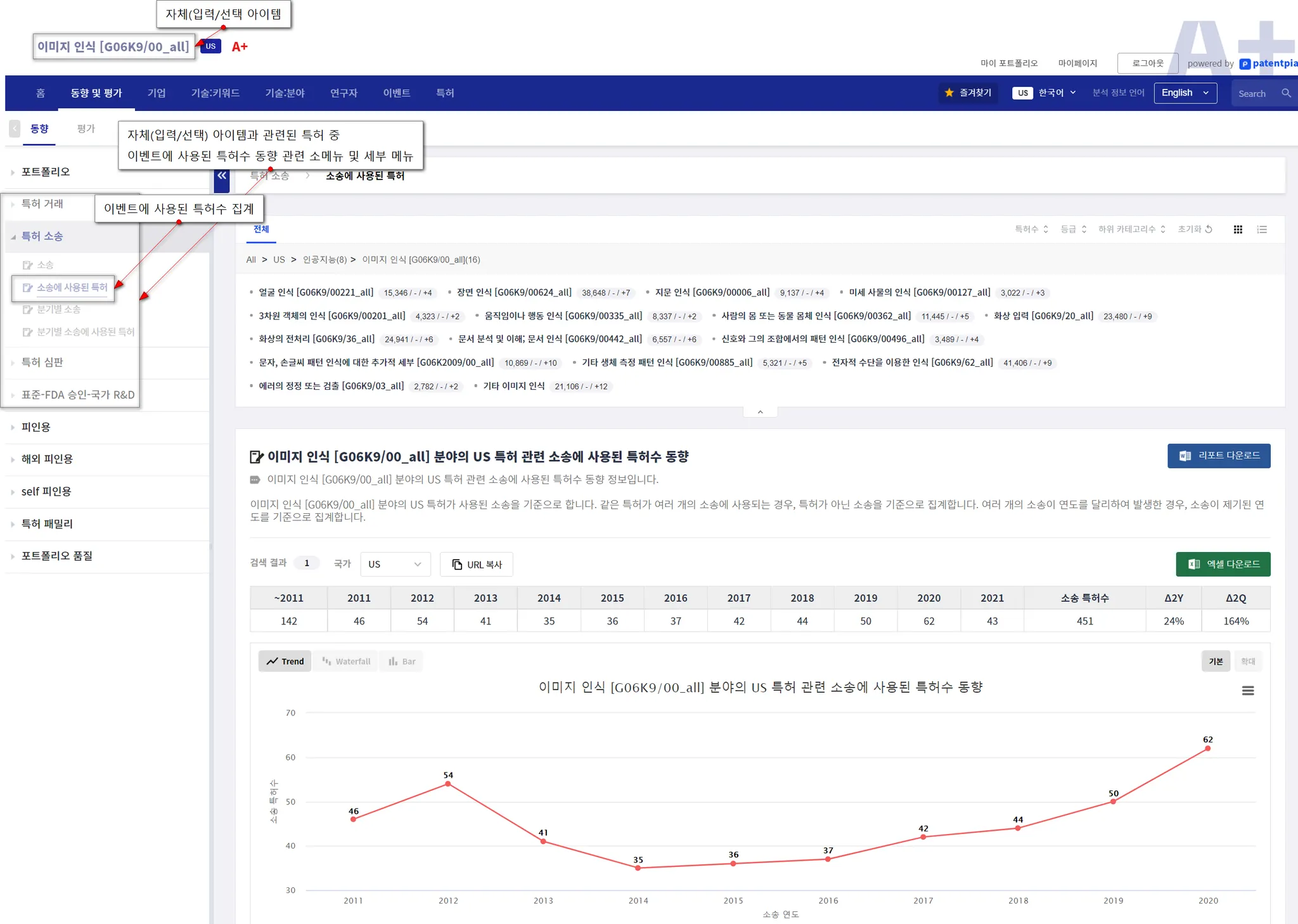 자체(입력/선택) 아이템과 배속/대응/맵핑된 특허셋이 있는 경우, 그 특허셋에 포함된 특허가 사용된 다양한 이벤트가 있습니다. 이러한 이벤트가 발생한 회수를 시계열적으로 분석할 수 있습니다.