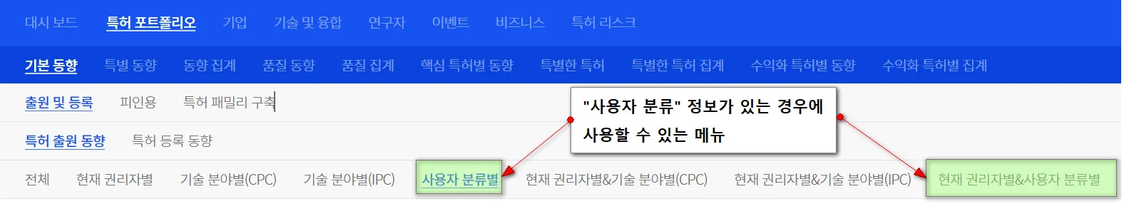 공통성 높은 메뉴로 (주로 4 depth 메뉴에 많이 나타나는), i) 전체, ii) 권리자별, iii) 기술 분야별, iv) 현재 권리자의 기술 분야별 등이 있습니다. 만약 주어진 특허셋에 “사용자 분류” 정보가 있다면, i) 사용자 분류별, ii) 현재 권리자의 사용자 분류별 메뉴가 더 나타납니다.