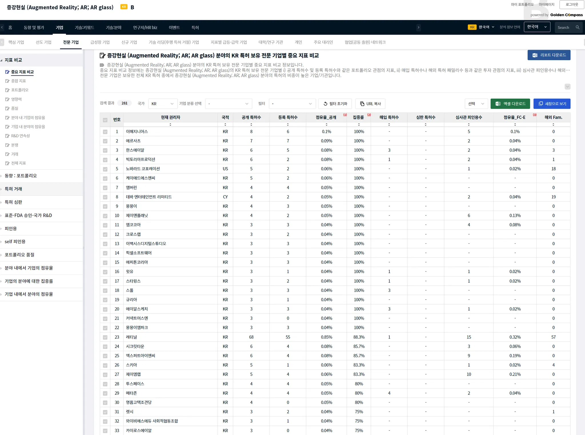 GoldenCompass는 주어진 기술 분야(화면 좌측 최상단에 표시됨)에 대한 전문성 높은 기업에 대한 정보를 ‘기업’ 1 depth 메뉴 밑에 → ‘전문 기업’ 2 depth를 제공합니다. 3 depth 메뉴에서 각 기업별 지표를 비교할 수 있습니다. 지표 비교에서 화면의 모든 기업의 집중률이 100%인 것을 알 수 있습니다. 집중률이 100%라는 것은 이들 기업이 보유하고 있는 특허의 100%가 이 분야의 특허라는 것입니다. 집중률이 높을수록 그 분야에 특화된 기업이라 할 수 있습니다.