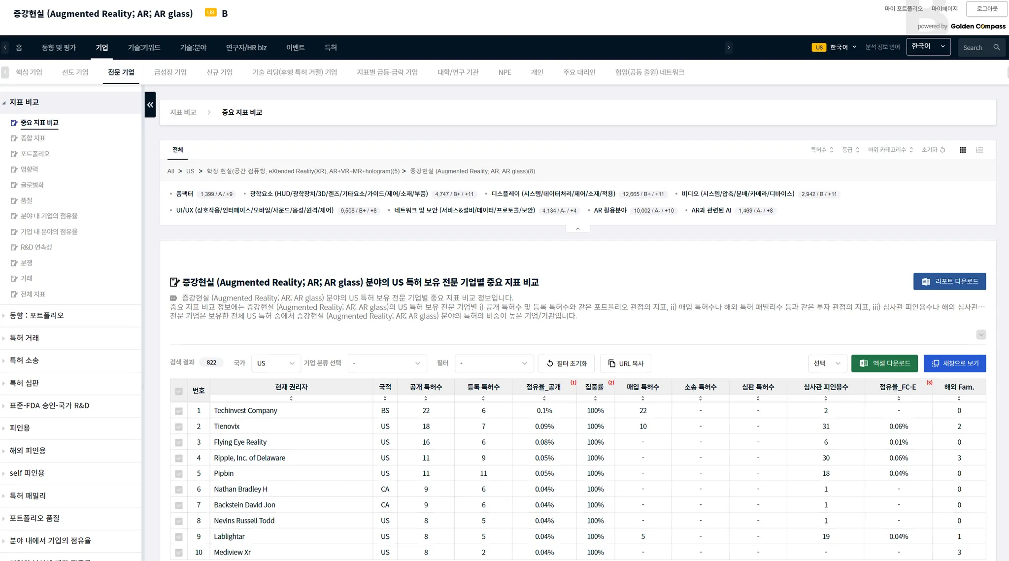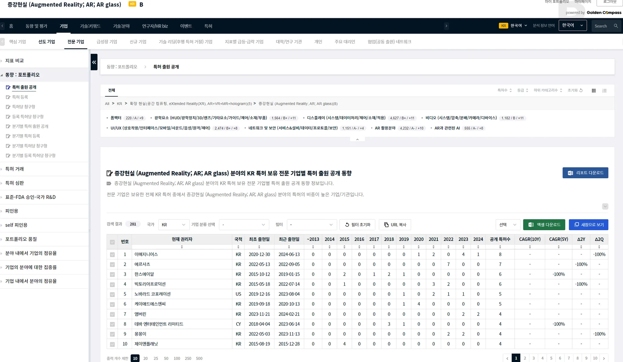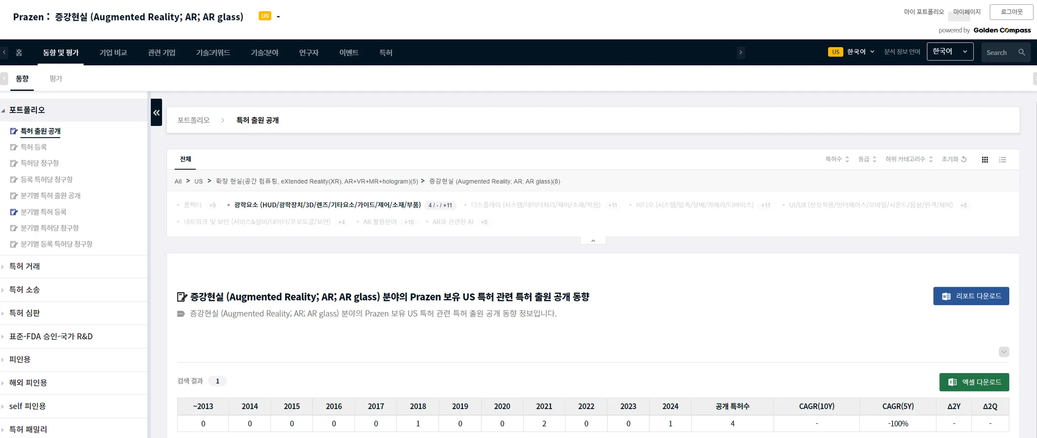 기술 카테고리나 CPC 특허 분류와 같이, 하위 기술 분야가 있는 경우에는 하위 분야를 선택할 수 있습니다. 특정한 기술 분야의 하위 기술 분야는 메뉴 UI와 분석 결과표 사이에에 있습니다. 아래 예시에서는 AR 분야의 하위 분야로, ‘폼팩터’, ‘광학요소’…등이 있음을 알 수 있습니다.