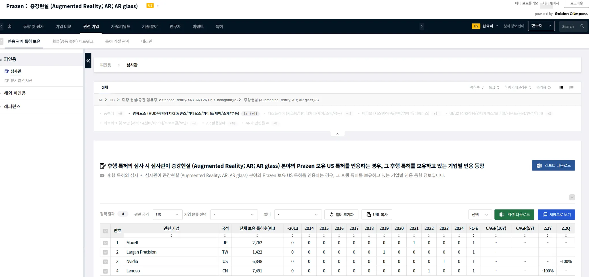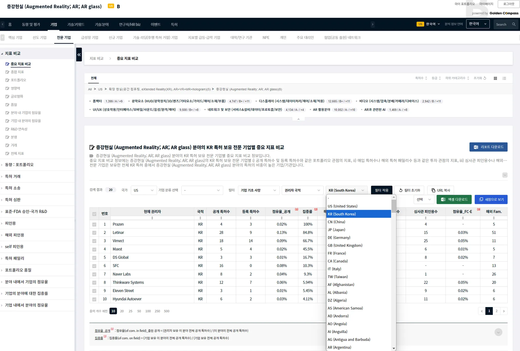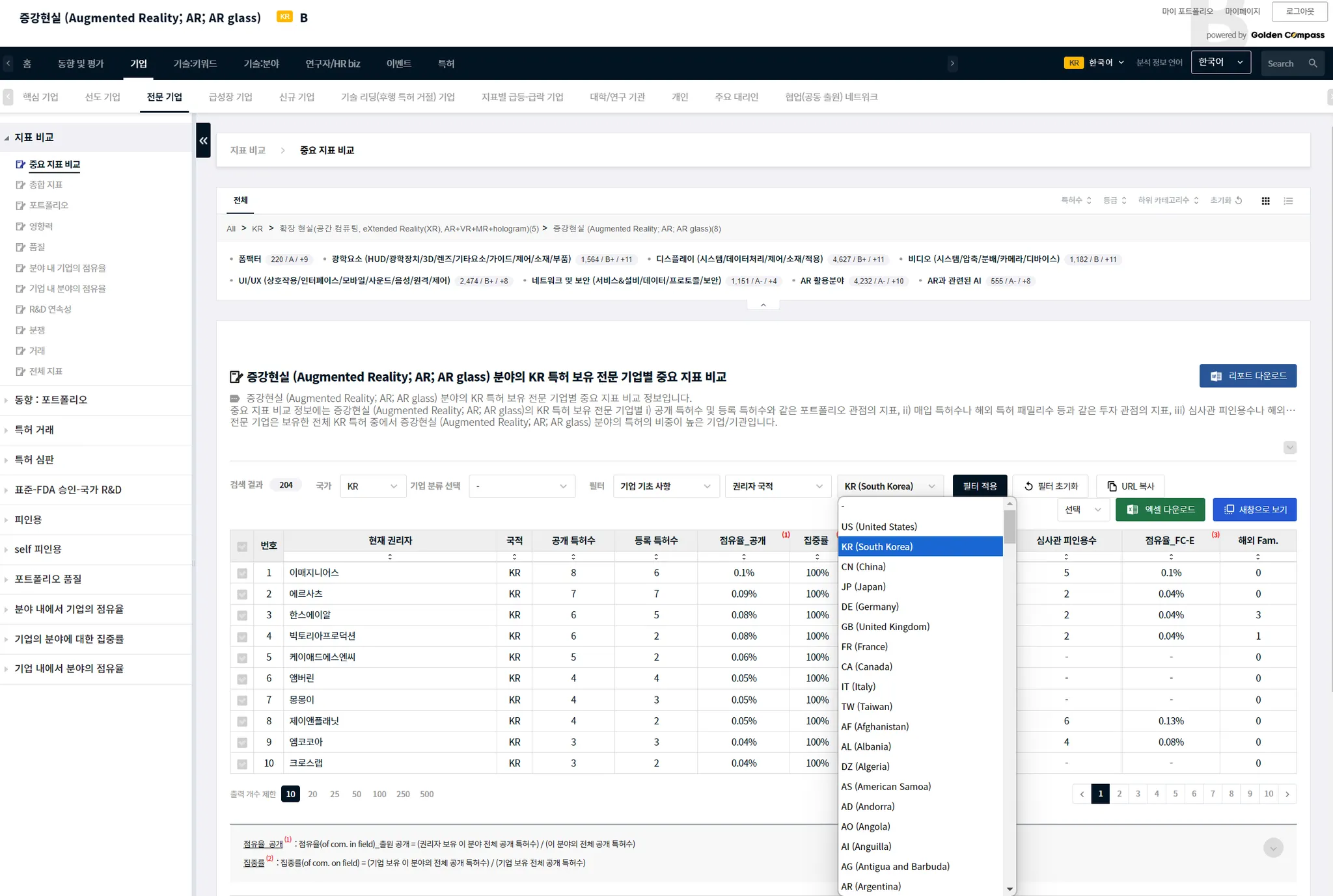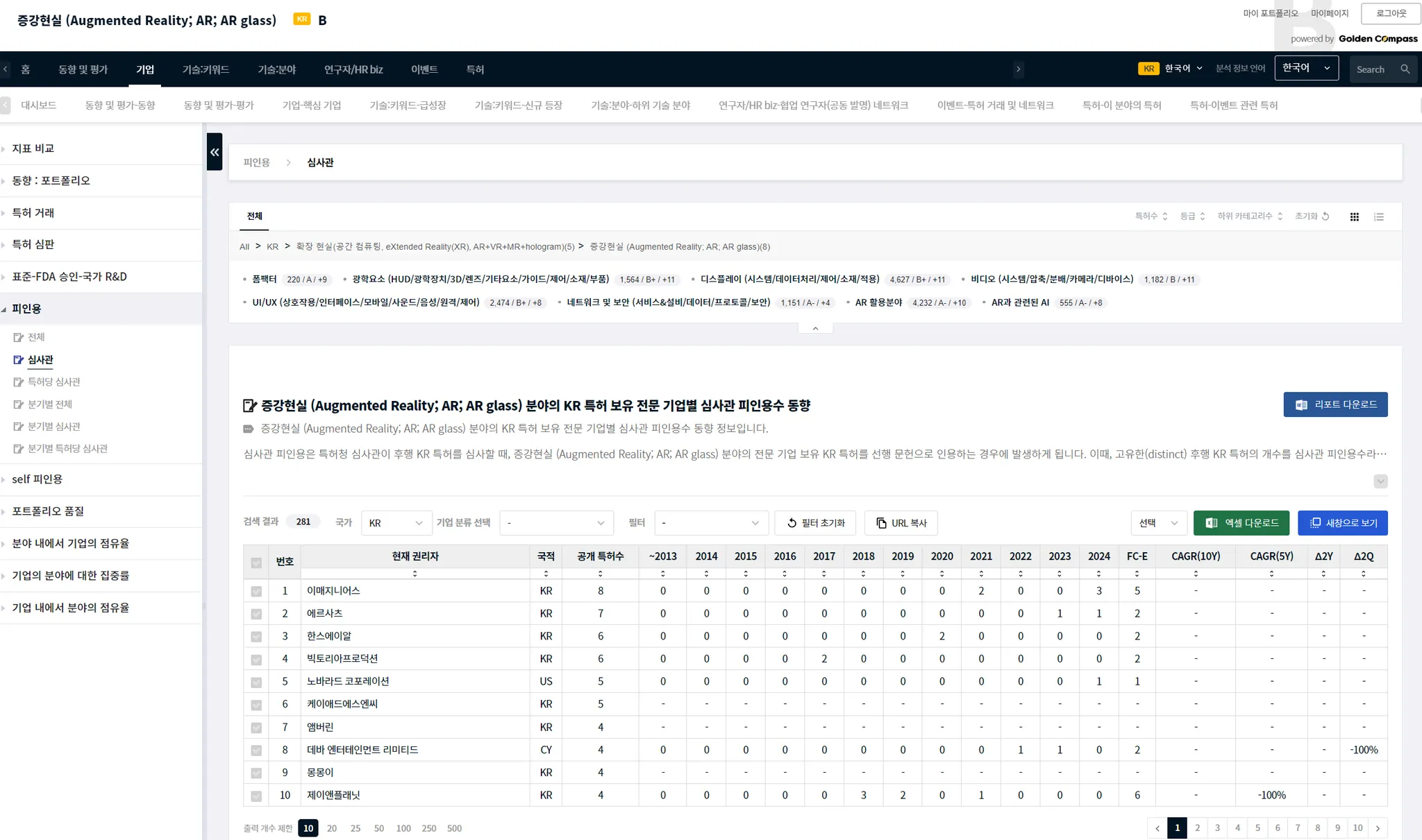 기술 카테고리나 CPC 특허 분류와 같이, 하위 기술 분야가 있는 경우에는 하위 분야를 선택할 수 있습니다. 특정한 기술 분야의 하위 기술 분야는 메뉴 UI와 분석 결과표 사이에에 있습니다. 아래 예시에서는 AR 분야의 하위 분야로, ‘폼팩터’, ‘광학요소’…등이 있음을 알 수 있습니다.