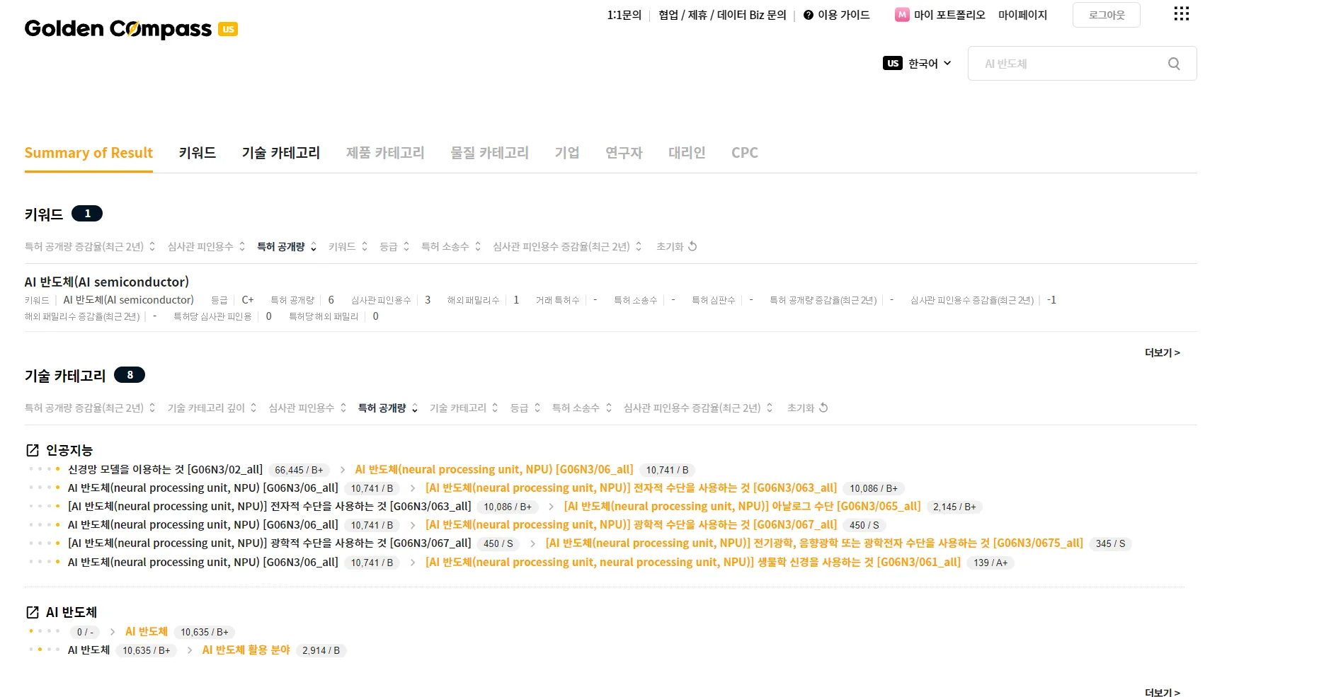 검색 결과로서, 키워드, 기술 카테고리 등 여러가지가 나타납니다. 입력한 검색어와 일치도가 높고, 특허수가 많은 것을 선택하는 것이 바람직합니다.