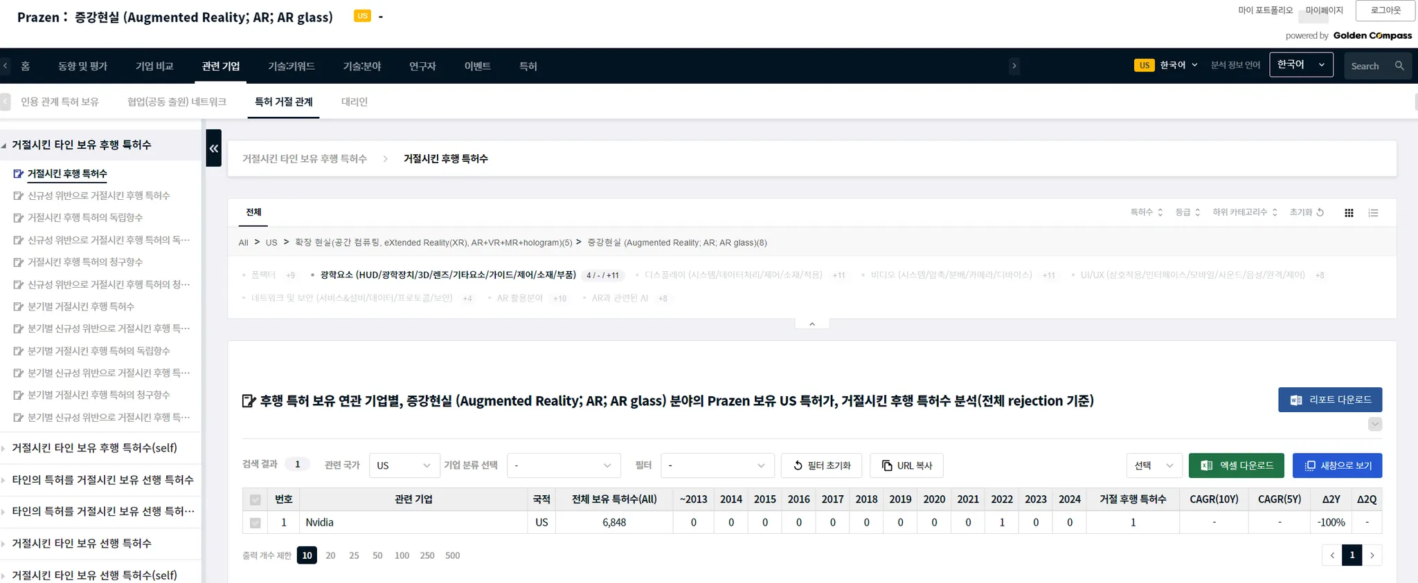 개별 기업의 특정 분야 보유 특허를 (심사관) 인용하는 후행 특허 보유 기업이나 그 보유 특허로 거절된 후행 특허 보유에 대한 정보를 알 수 있습니다.