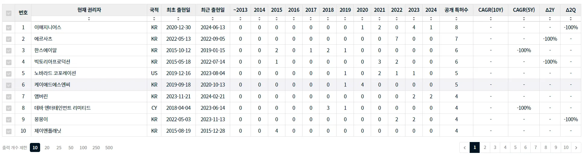 아래 예시에서, 이매지니어스는 이 분야에 특허가 2020년에 최초로 공개되었기 때문에 스타트업 기업이라 할 수 있습니다. 하지만, 제이앤플래닛은 2015년에 이 분야 특허가 최초로 공개되었기 때문에, 관점에 따라서 스타트업 기업이라 볼 수 없을 수도 있습니다.