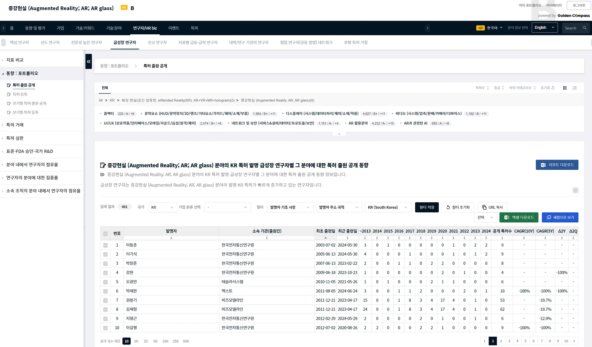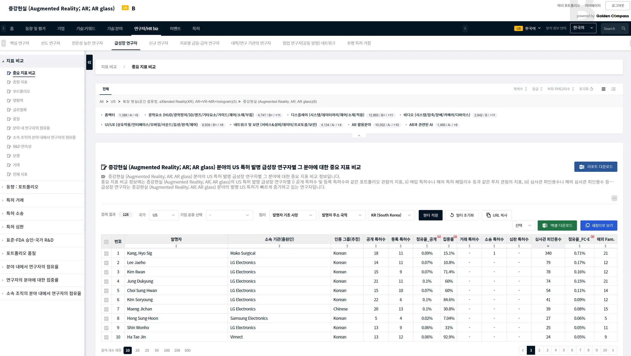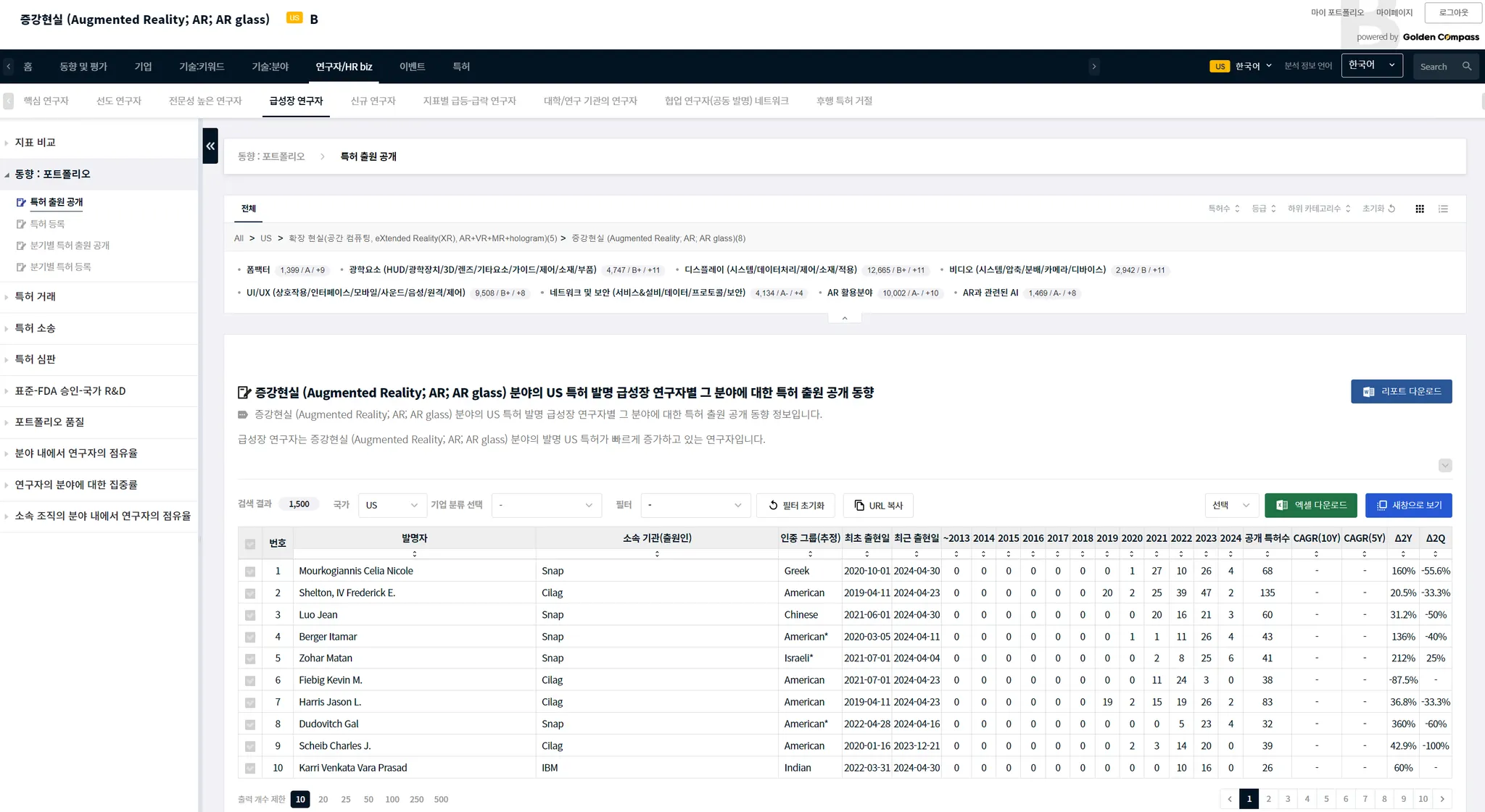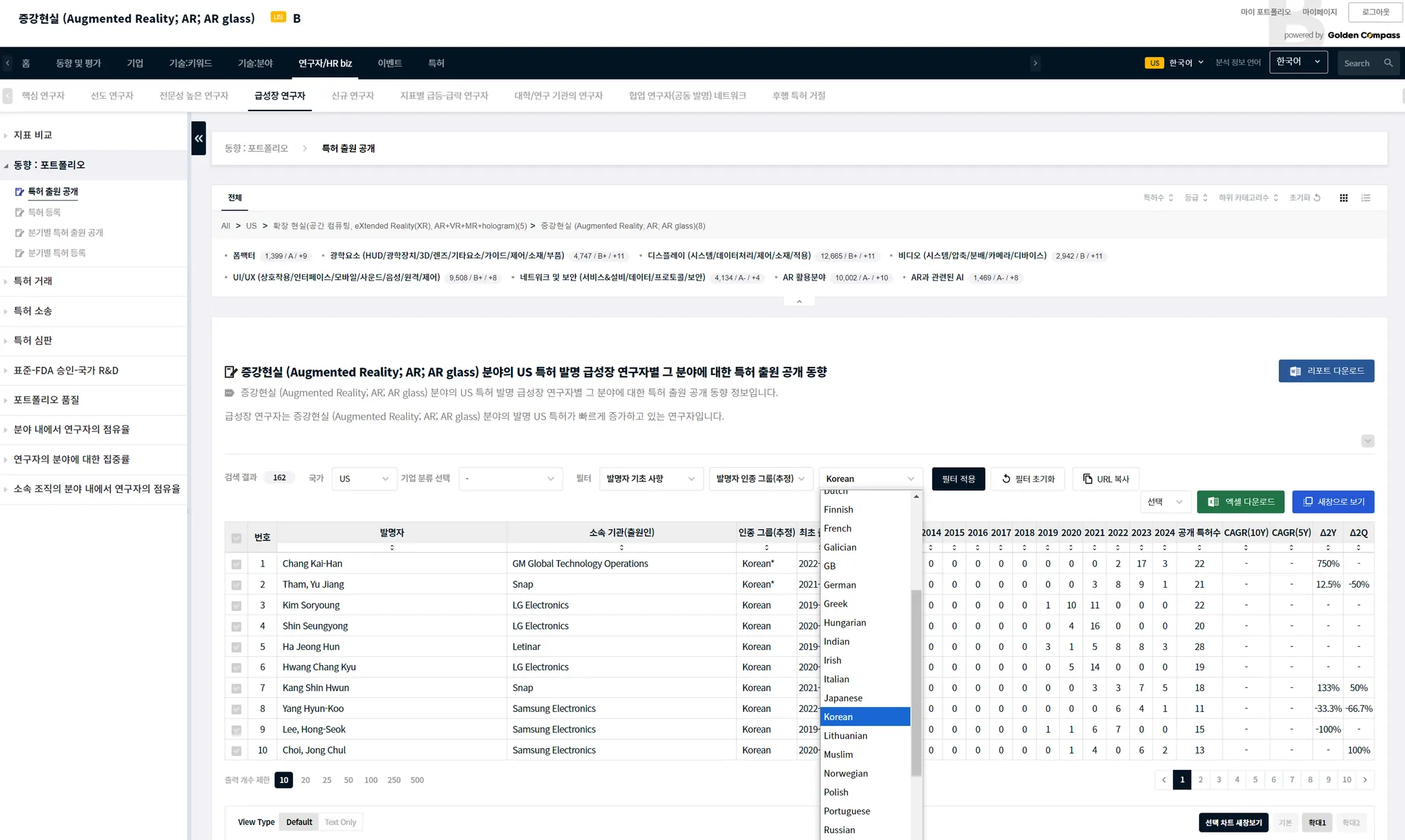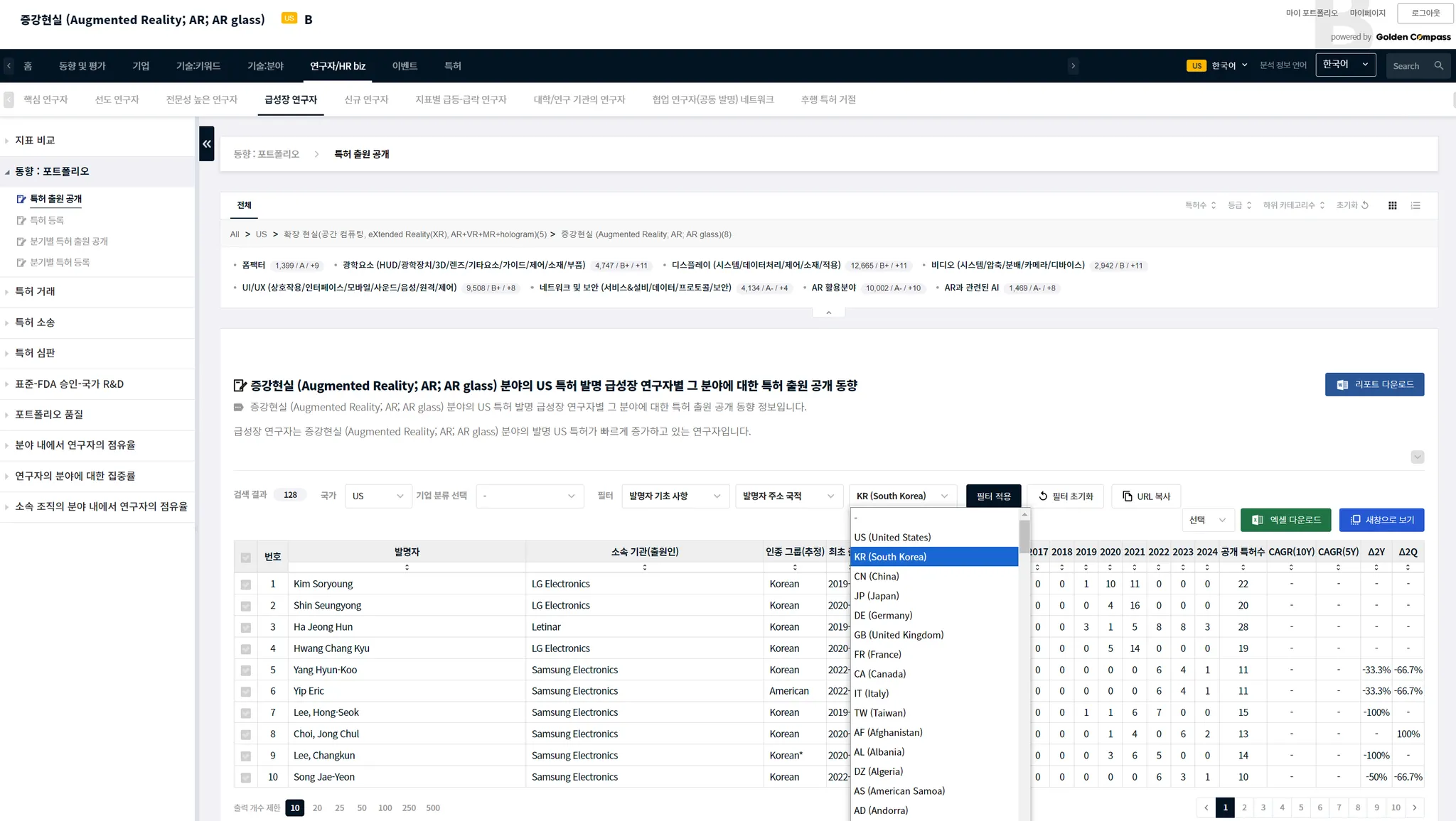 국가를 US로 선택한 다음에 확인을 클릭하면, 미국 특허를 발명한 AR에 관련된 급성장 연구자가 나타납니다.