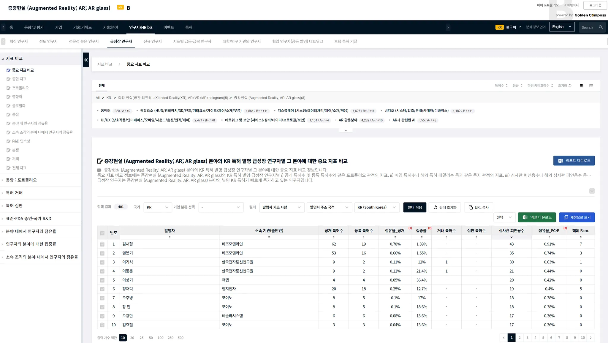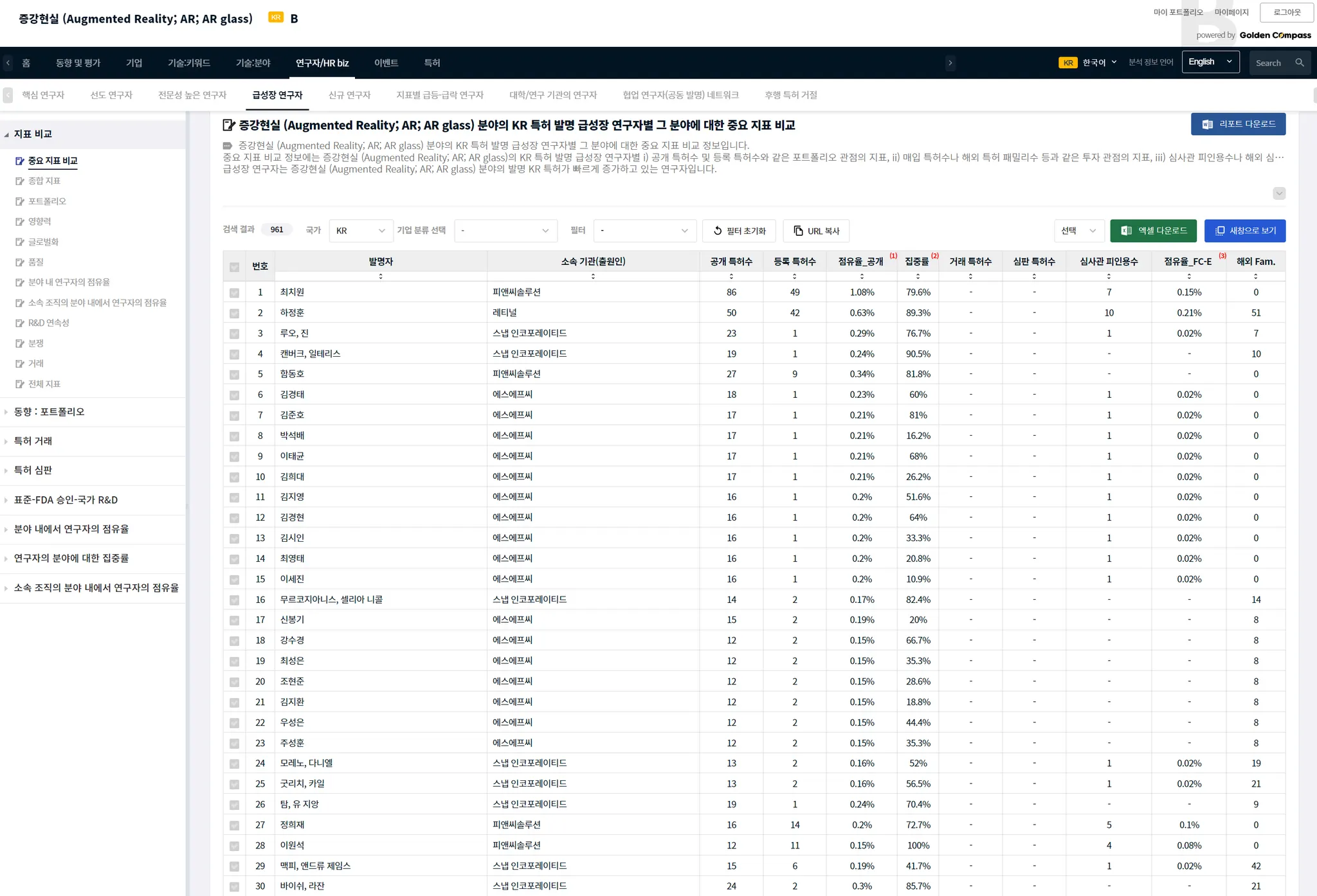 필터를 사용하면, 미국 특허청에서 특허를 다수 보유하고 있는 급성장 연구자 중 한국계 연구자만 선별하여 분석할 수 있습니다.