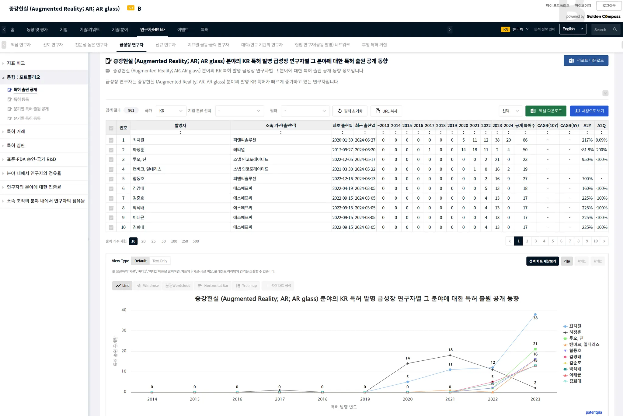 아래 화면은 AR 분야 한국 국적의 급성장 연구자별 보유 특허가 받은 피인용수 동향입니다.