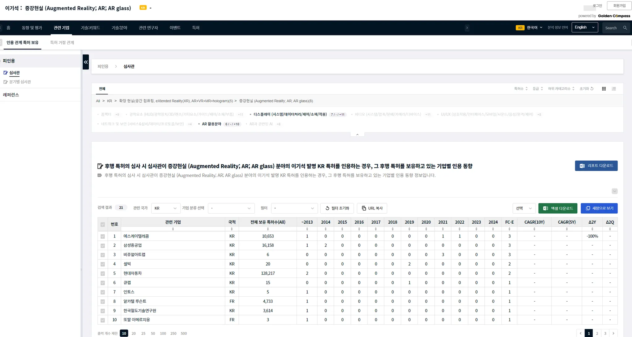 기술 카테고리나 CPC 특허 분류와 같이, 하위 기술 분야가 있는 경우에는 하위 분야를 선택할 수 있습니다. 특정한 기술 분야의 하위 기술 분야는 메뉴 UI와 분석 결과표 사이에에 있습니다. 아래 예시에서는 AR 분야의 하위 분야로, ‘폼팩터’, ‘광학요소’…등이 있음을 알 수 있습니다.