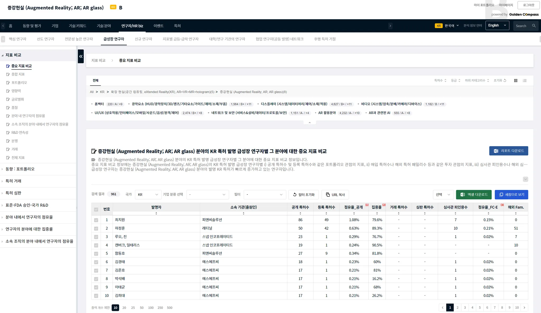 아래 예시는 기술 분야의 예시로, 증강 현실(AR, augmented reality)에 집중하고 있는 급성장 연구자에 대한 GoldenCompass 화면입니다.