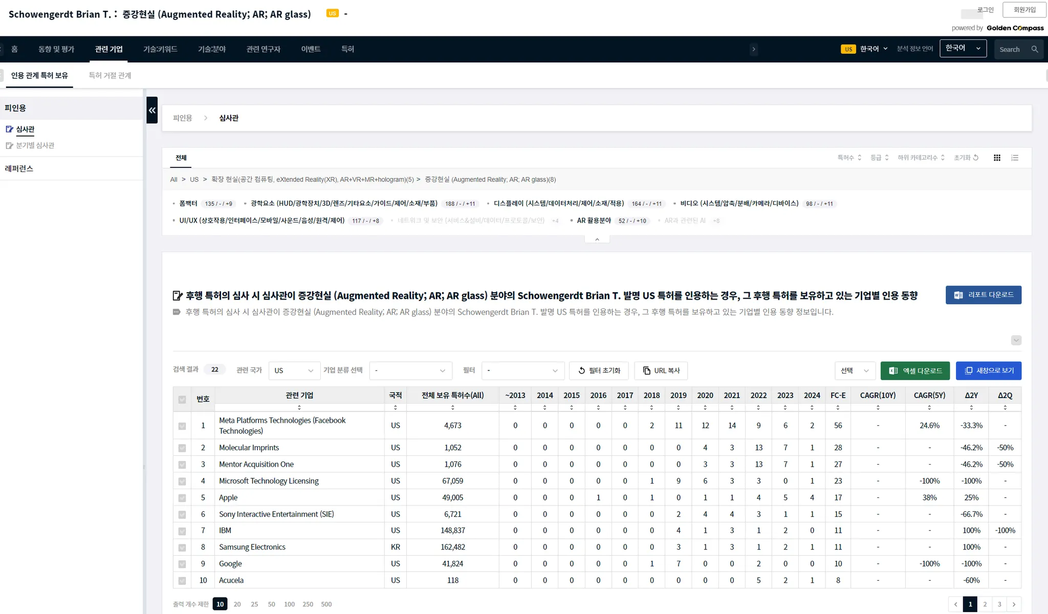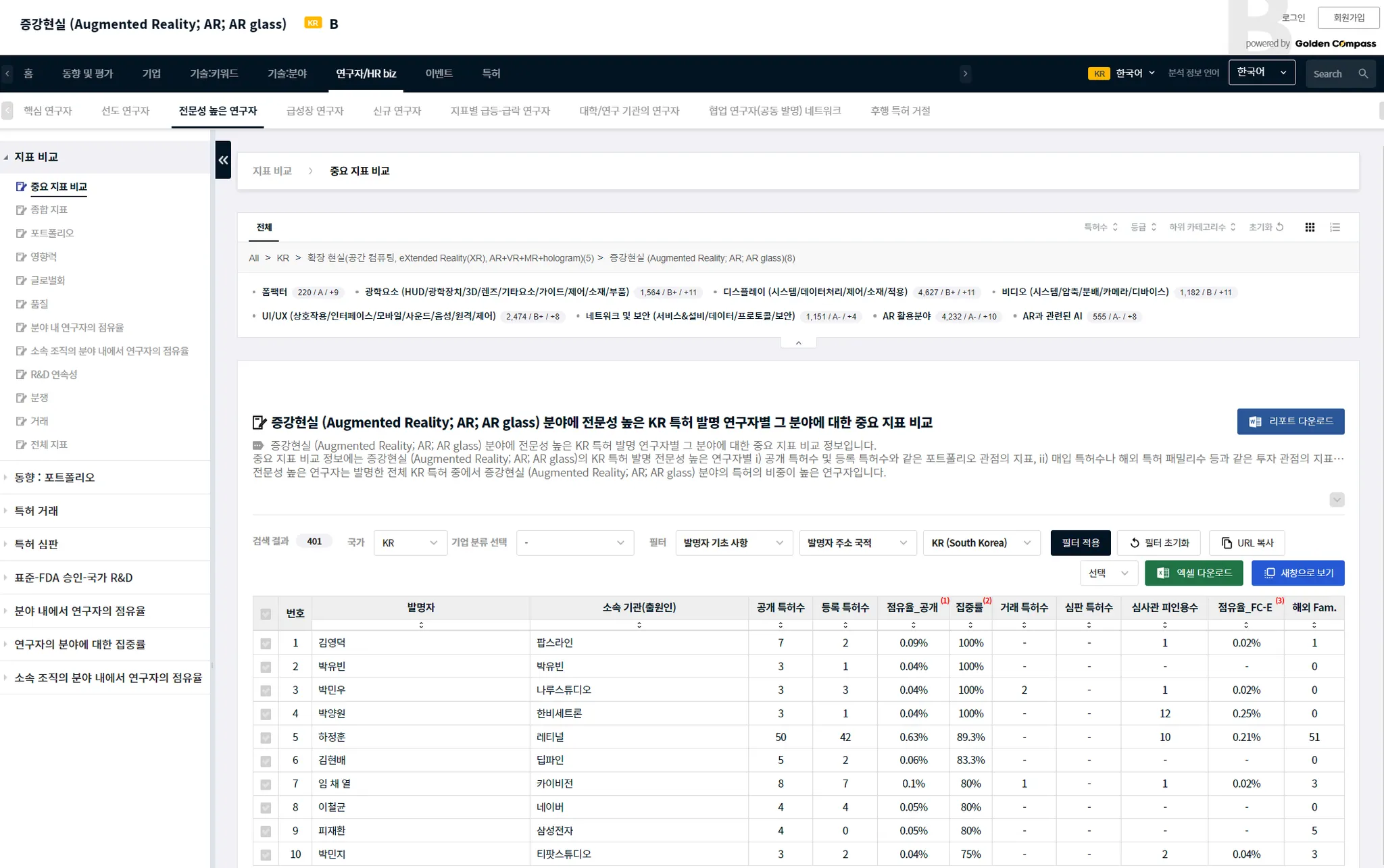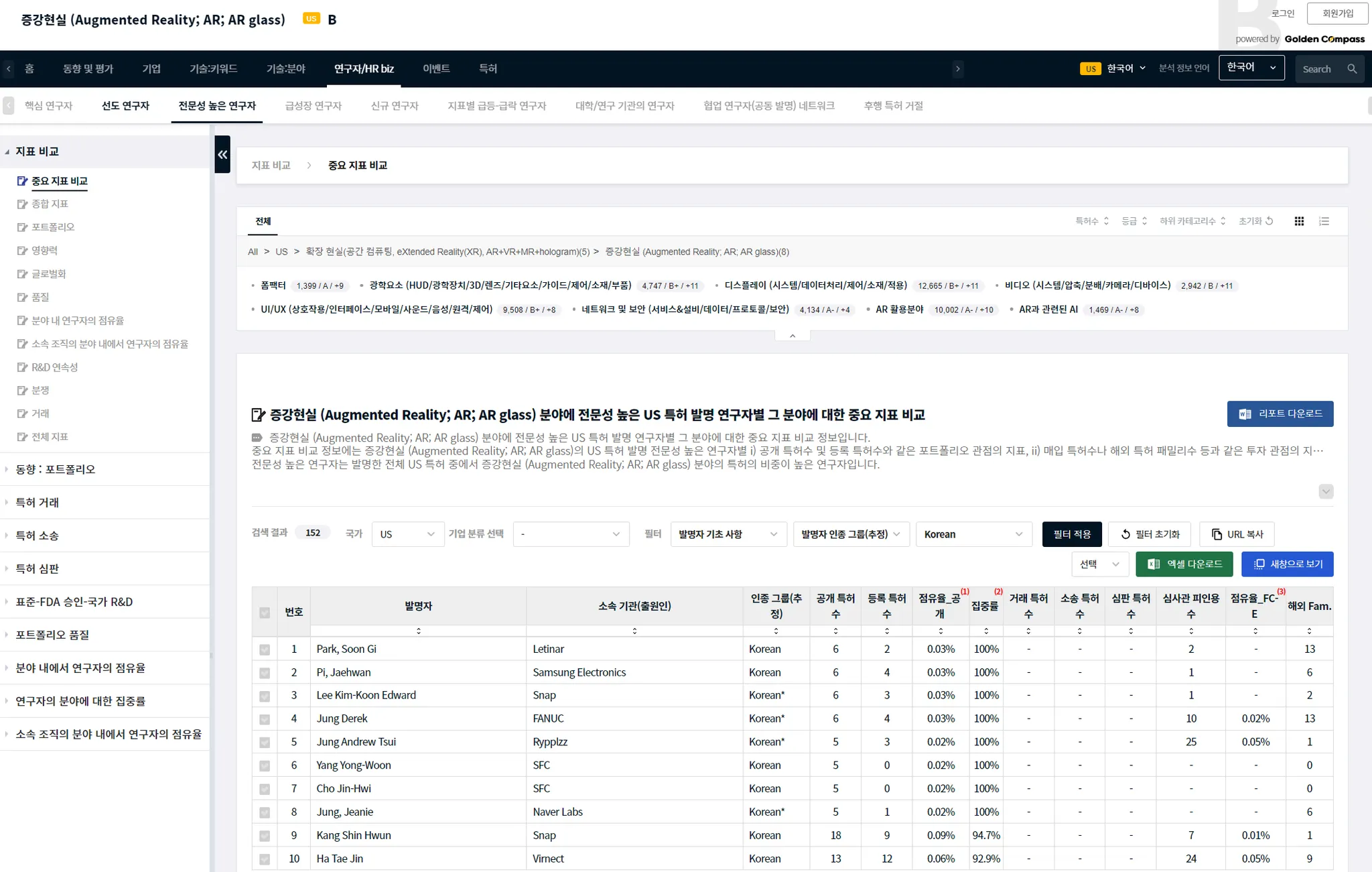 GoldenCompass는 i) 기술 분야별, ii) 기업/기관별,iii) 기업/기관의 기술 분야별, iv) 개별 연구자별로 연구자에 대한 상세한 평가-분석-비교 콘텐츠를 제공합니다.