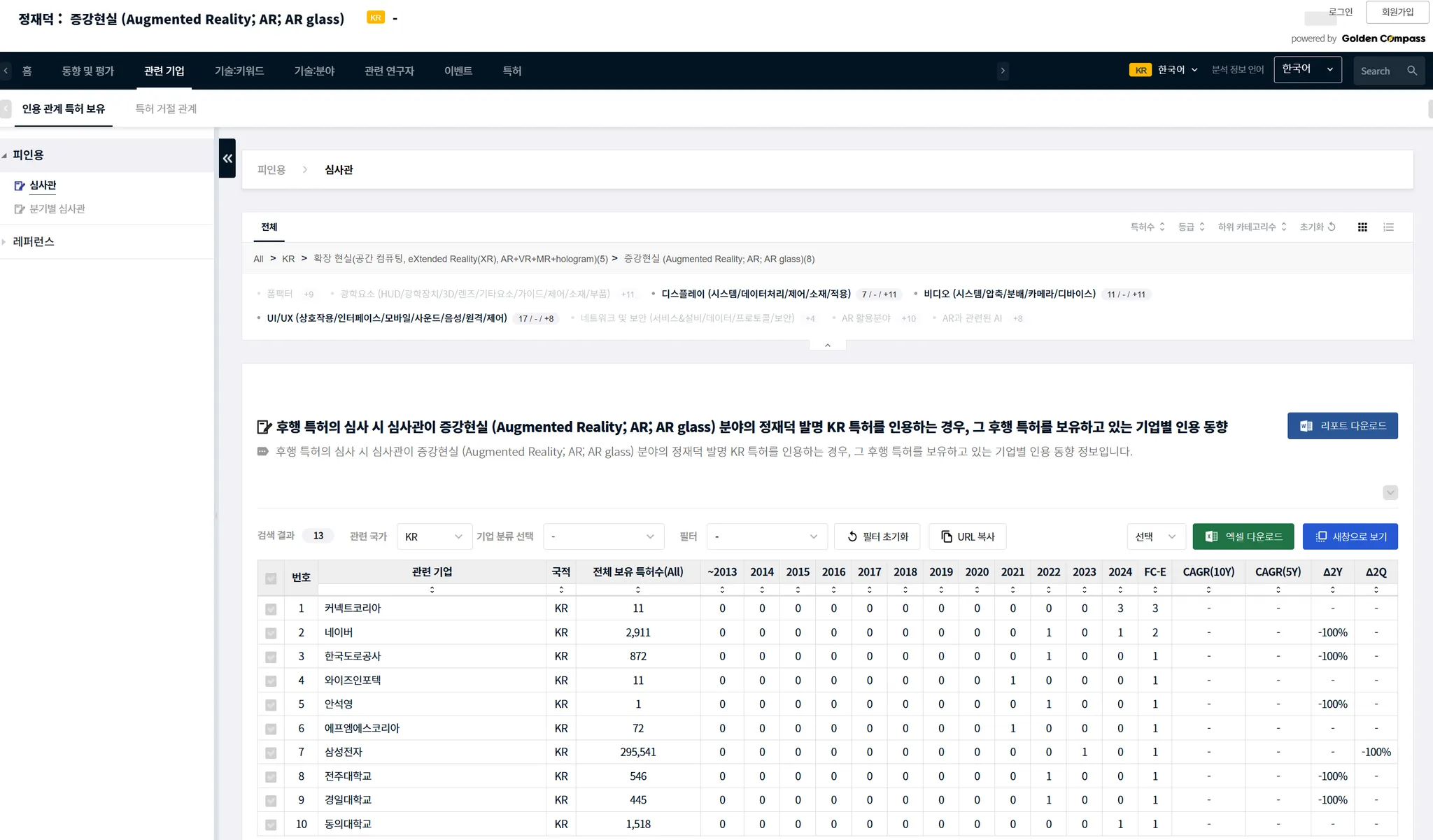 아래 예시는 증강 현실 분야의 한국 특허 발명자 정재덕(LG전자 소속)의 발명 특허를 인용하는 후행 특허 보유 기업/기관에 대한 정보입니다.