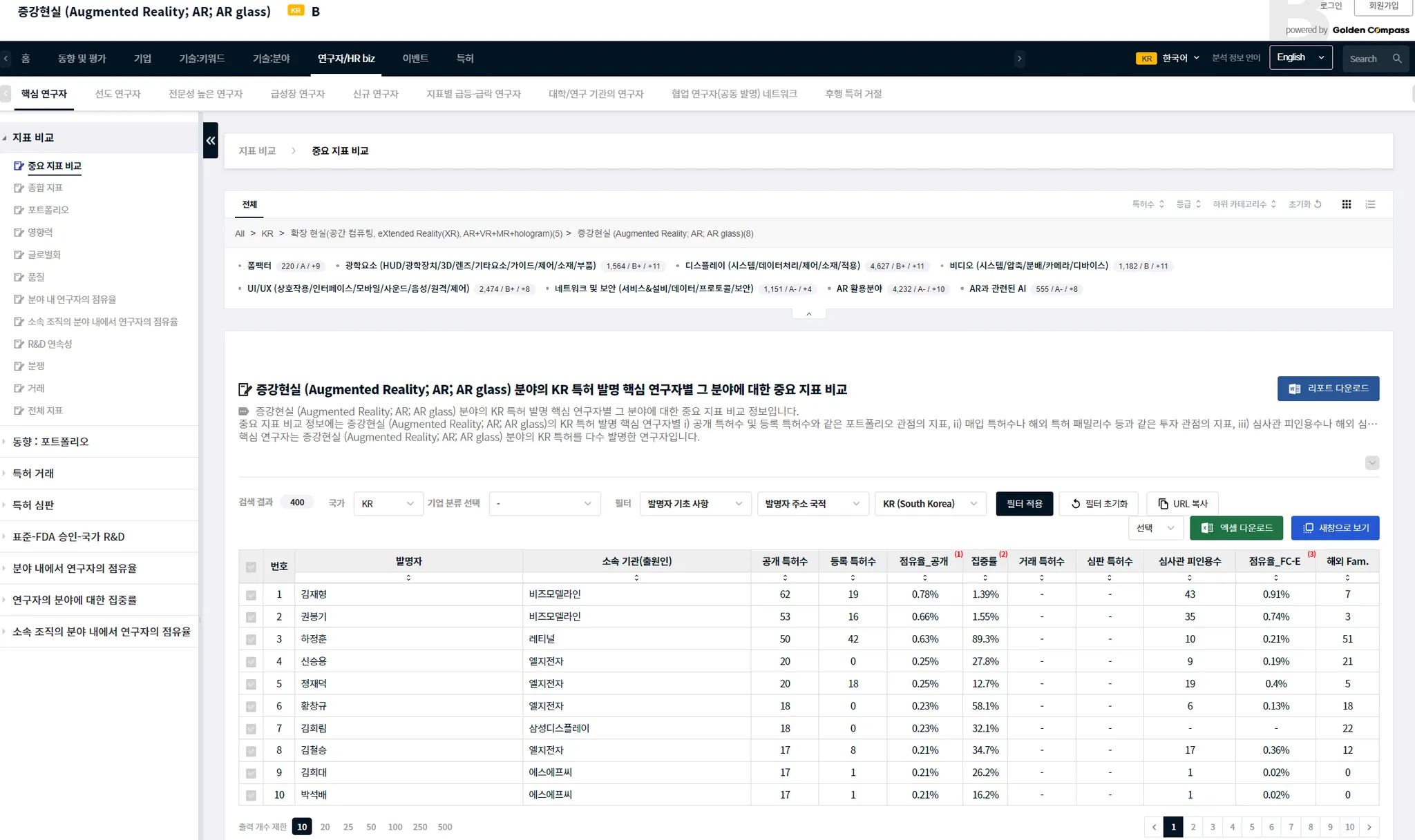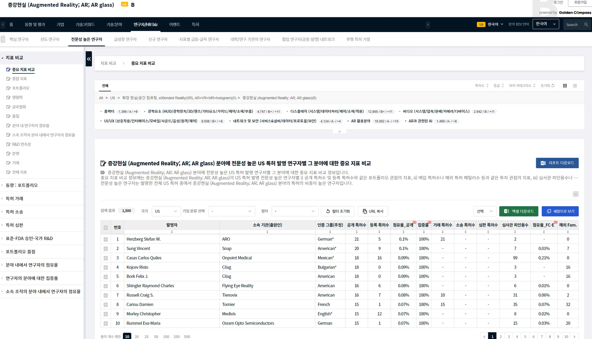 아래 예시는 기술 분야의 예시로, 증강 현실(AR, augmented reality)에 집중하고 있는 미국 특허를 발명한 전문성 높은 연구자에 대한 GoldenCompass 화면입니다.