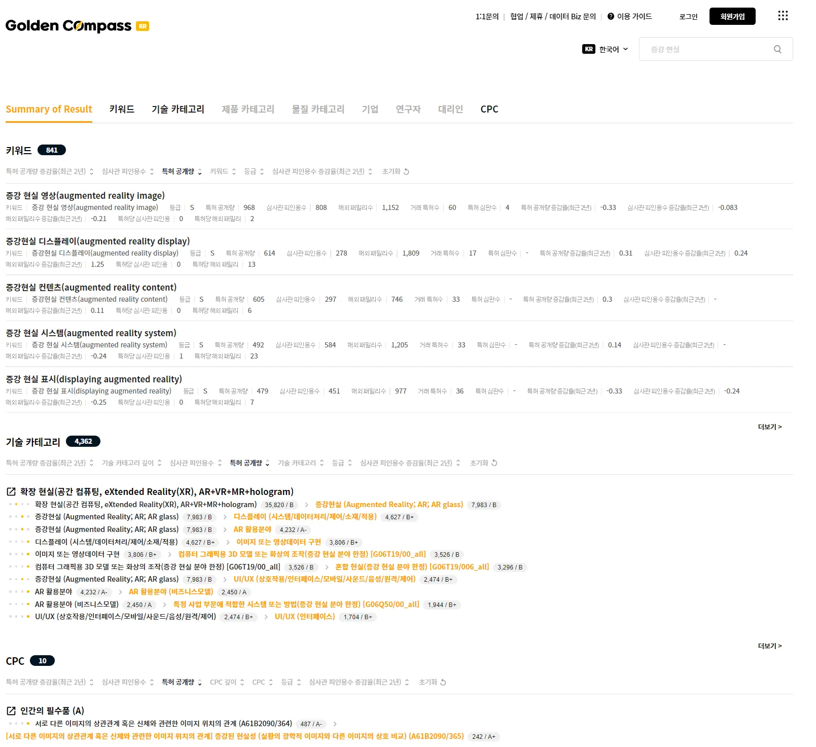 www.patentpia.com 또는 goldencompass.patentpia.com의 검색창에 ‘증강 현실’ 또는 ‘augmented reality’를 입력합니다.