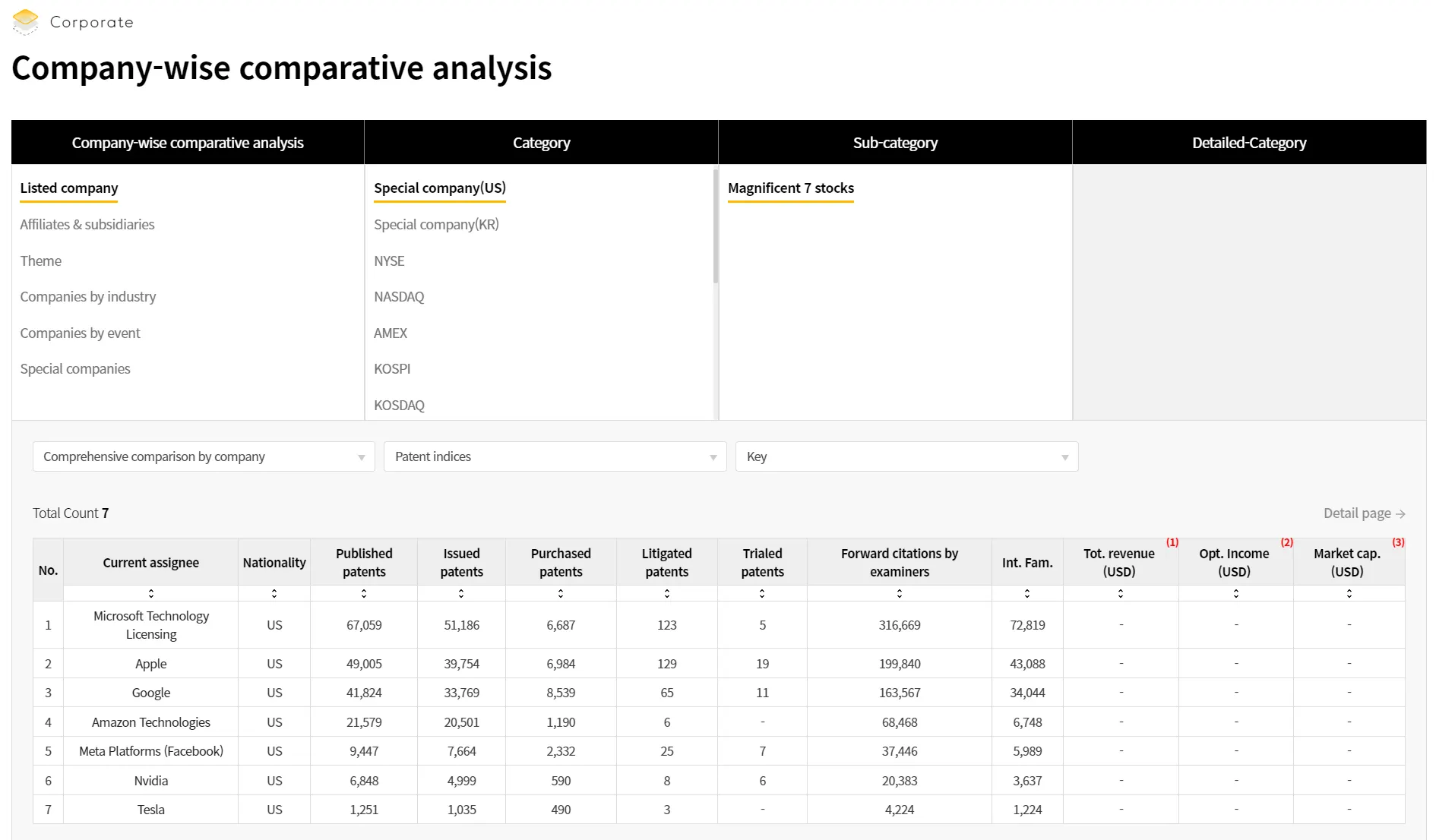 GoldenCompass provides analytical contents such as i) various trends, ii) various keywords included in the patents, iii) various fields related to the patents (technology, product/parts, materials/substances, etc.), iv) researchers who invented the patents, v) events related to the company or patents in possession, vi) patents, etc. for all (open and issued) patents held by the company in a particular nation.