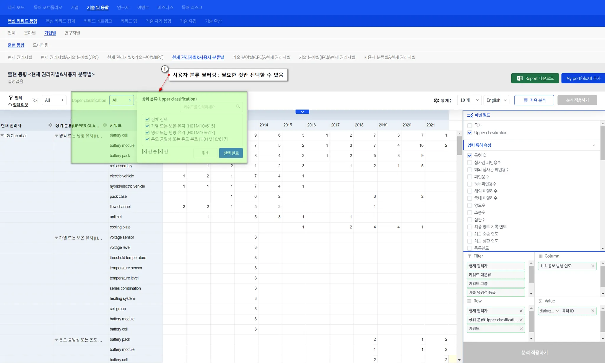 특허 분석에 사용된 테크 트리/사용자 분류 중에서 필요한 것만 선택(필터링)할 수 있습니다.
