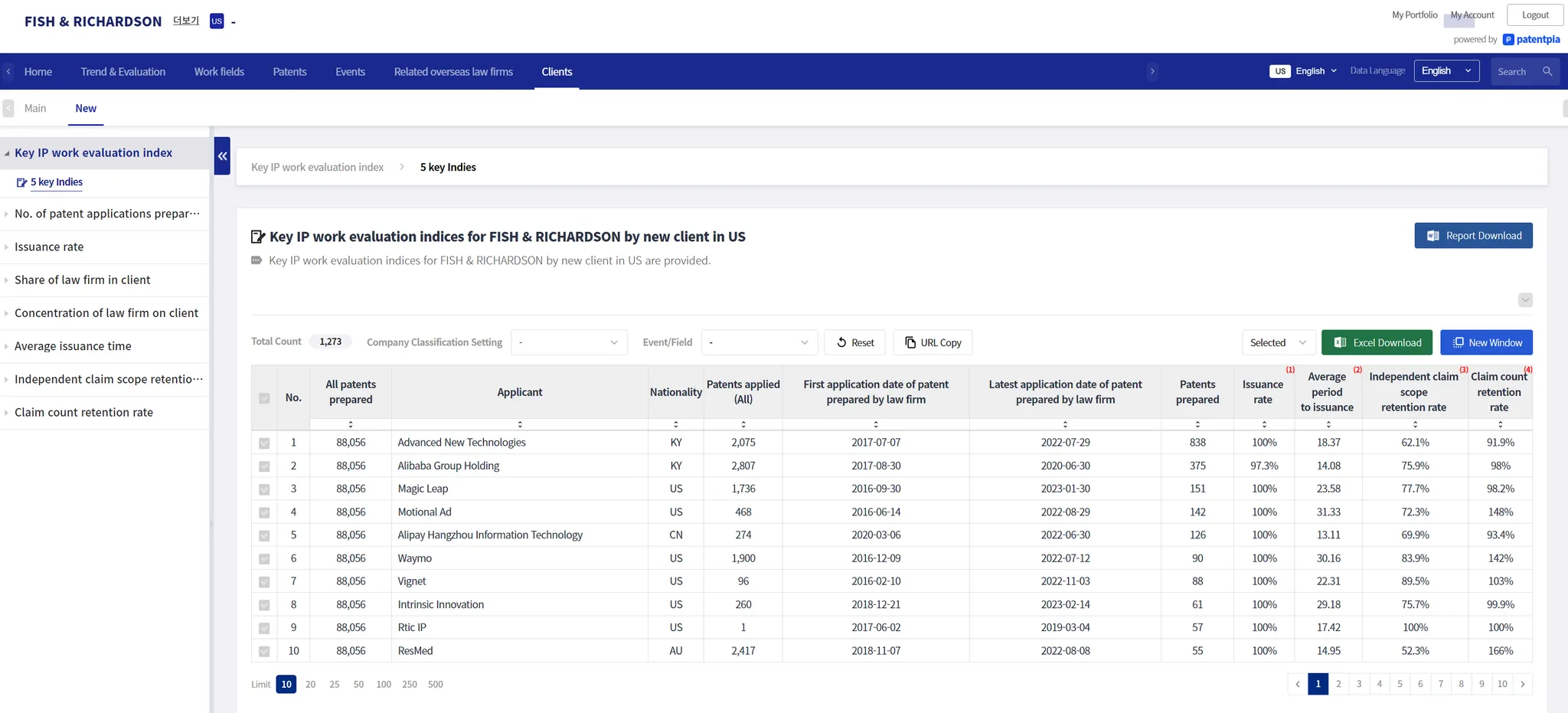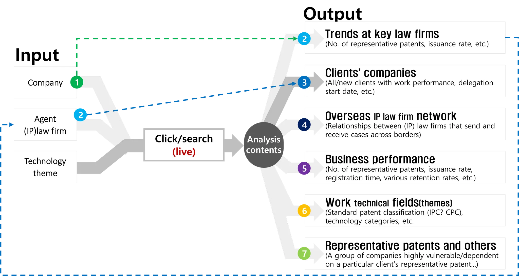 The analysis of agents for individual IP law firms includes i) Trends in proxy, ii) Technology fields represented, iii) Representative patents, iv) Clients, v) Overseas agent networks, etc.