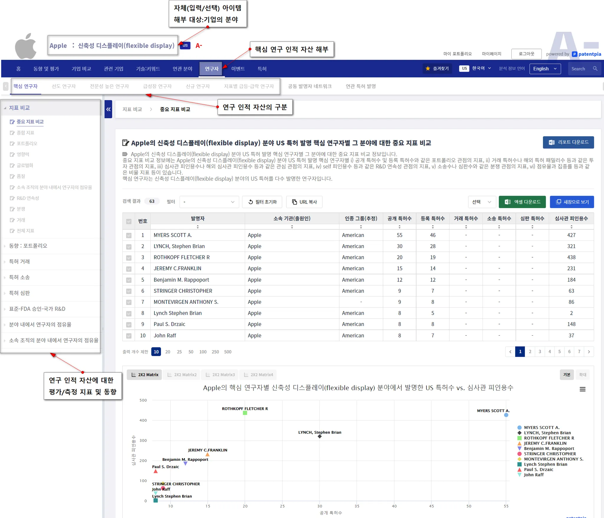 Analytics는 특허셋을 대상으로 max 5,000여 가지의 분석-재분석을 제공하는 체계입니다. 관심을 가지는 대상을 기업, 분야 또는 기업의 분야로 한정하기 어려운 경우가 있습니다. 이때, 그 관심 대상을 특허셋(예, 특허 검색 엔진을 사용한 결과인 특허리스트)으로 특정할 수 있습니다. Analytics의 “연구자 대메뉴” 아래에 있는 각종 하위 메뉴를 선택하면, 특허셋을 구성하는 특허를 발명한 연구자에 대한 각종 분석 결과를 생성할 수 있습니다.