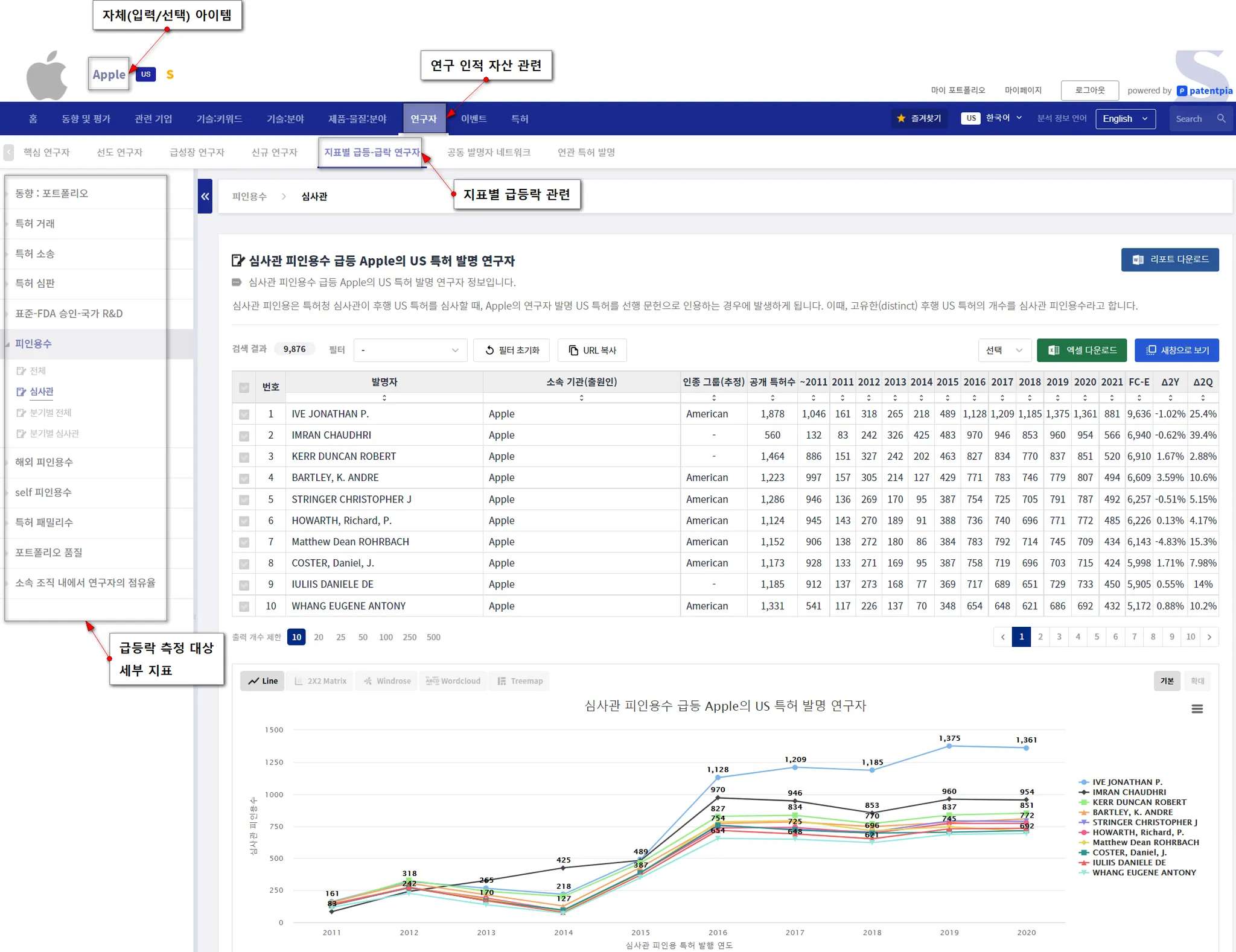 지표에는 i) 국내외 각종 피인용, ii) 국내외 특허 패밀리, iii) 포트폴리오 품질, iv) 각종 점유율 등이 있습니다.