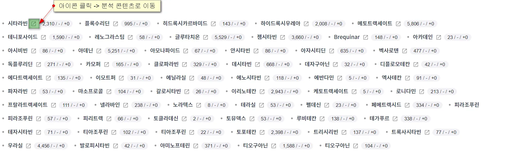소재-물질 명칭 옆에 있는 아이콘을 클릭하면, 해당 소재-물질 명칭에 대응되는 각 국가별 소재-물질 분석 콘텐츠(max 2,000여종)가 제공됩니다.