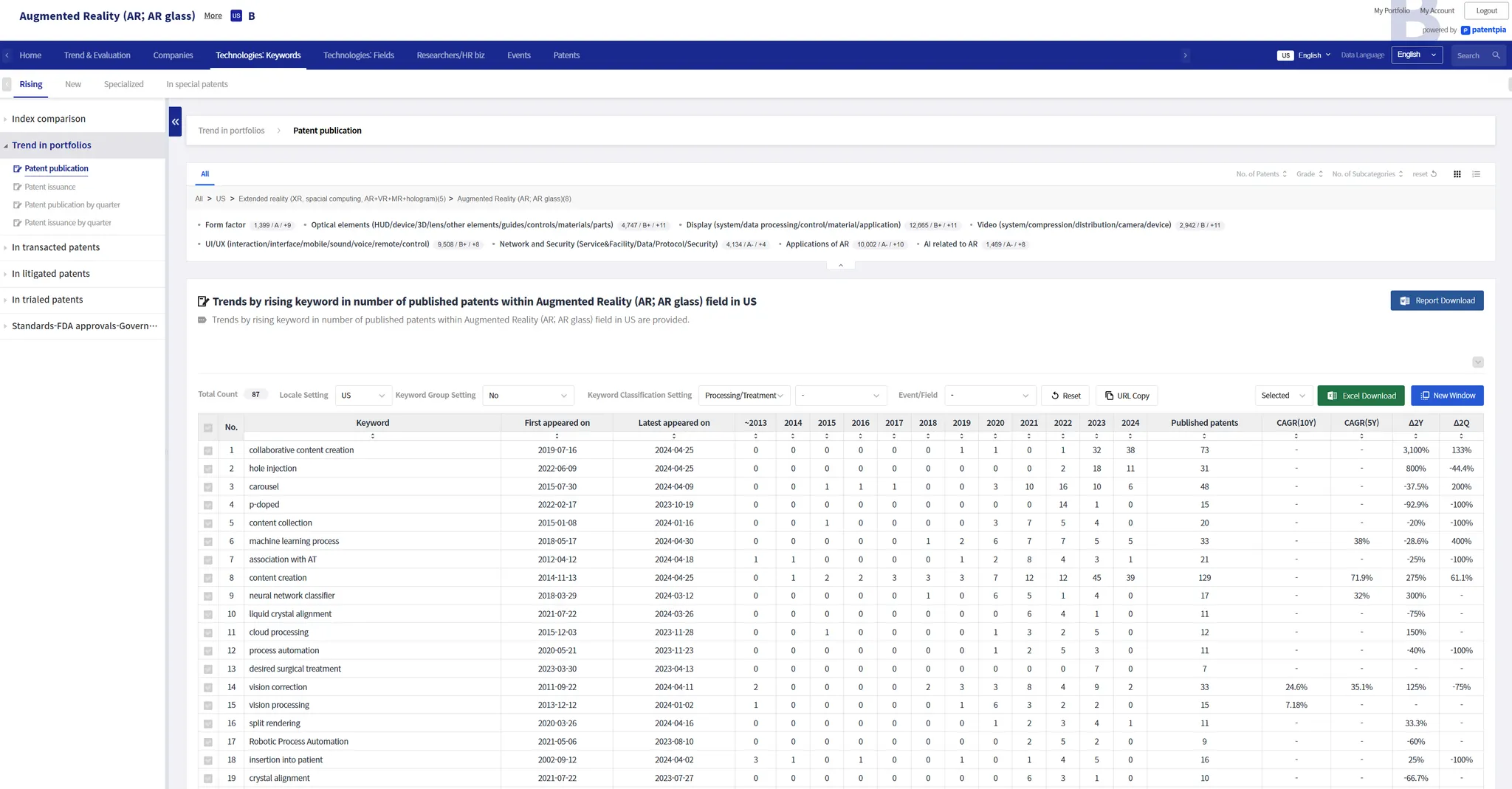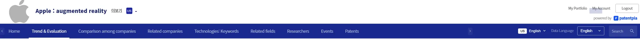 When you click "Apple" on the "augmented reality" screen, the analysis result page for "Apple's augmented reality" appears as shown below. The "Apple's augmented reality" page provides more than 100 to 2,000 different analysis contents for the compound (company & keyword) item "Apple's augmented reality". The example below is the simplest example, showing trends in patent applications in the US for "Apple's augmented reality".