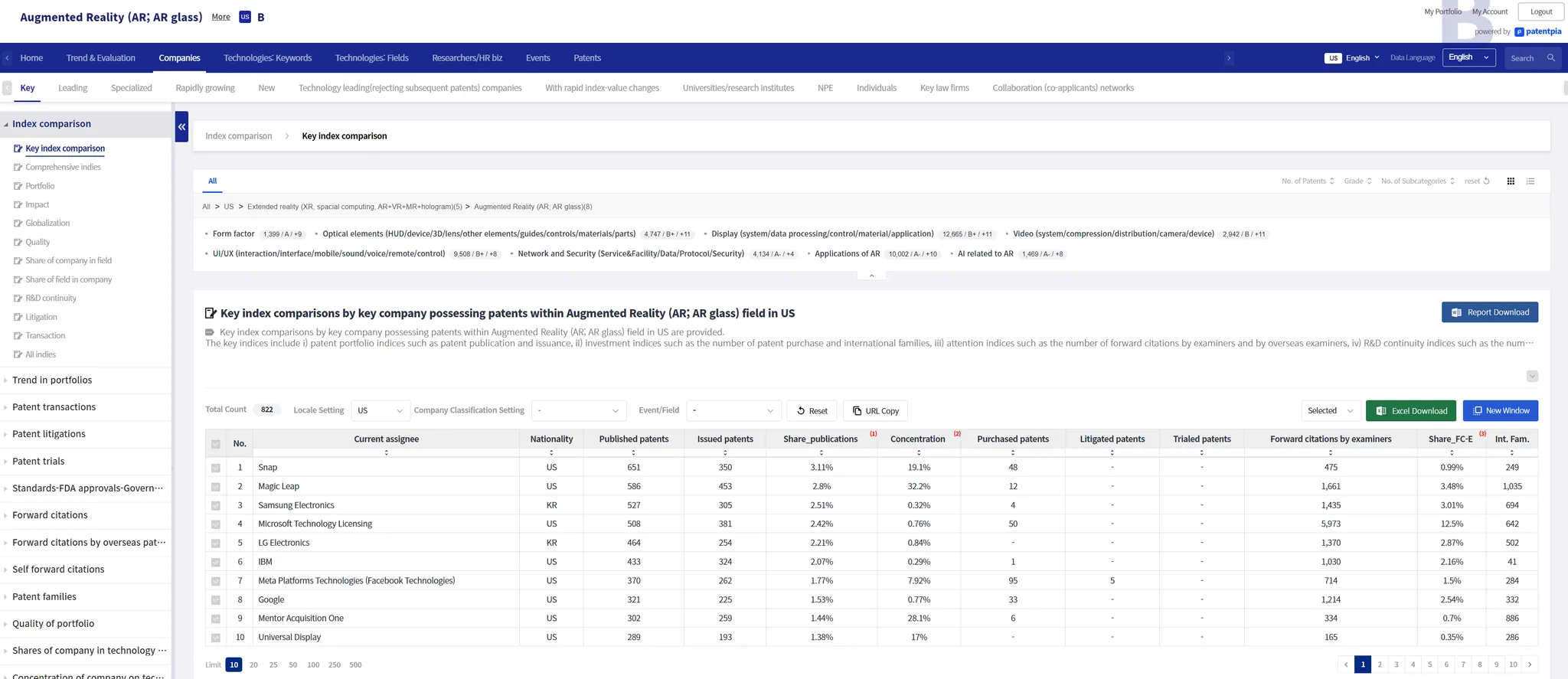 Key companies : Companies with many patents in possession in a specific field