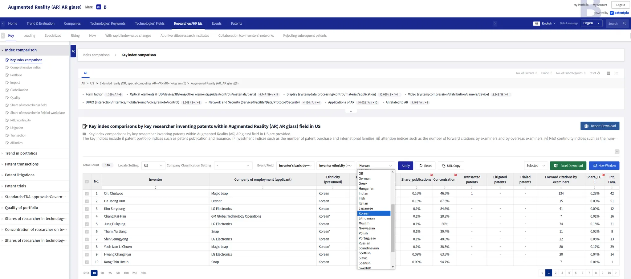 PatentPia provides classification data on researchers who are inventors of patents. The classification of researchers includes i) key researchers, ii) leading researchers, iii) rising researchers, iv) specialized researchers, v) new researchers, and vi) researchers at universities/research institutes.