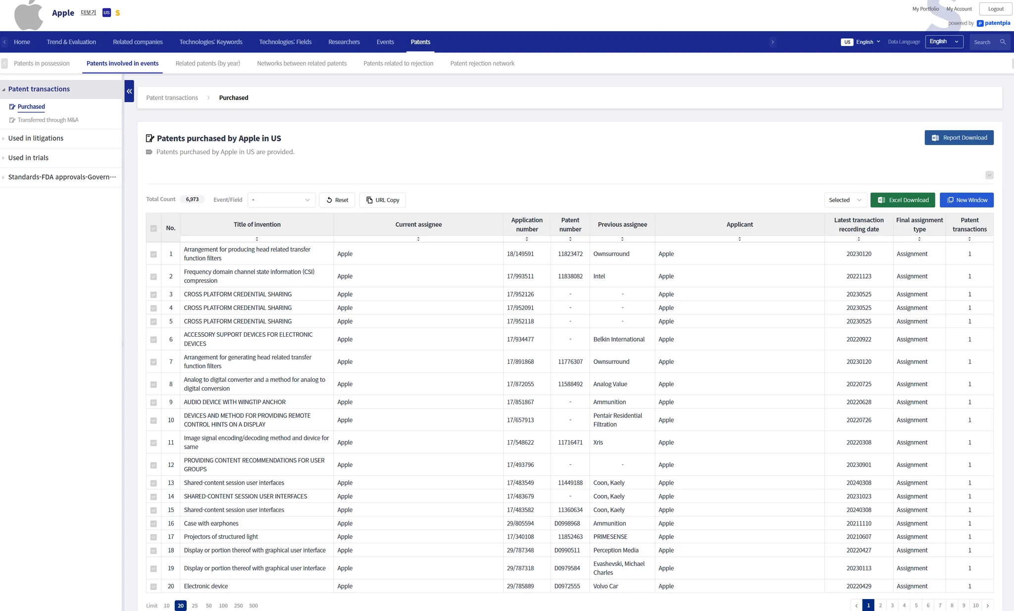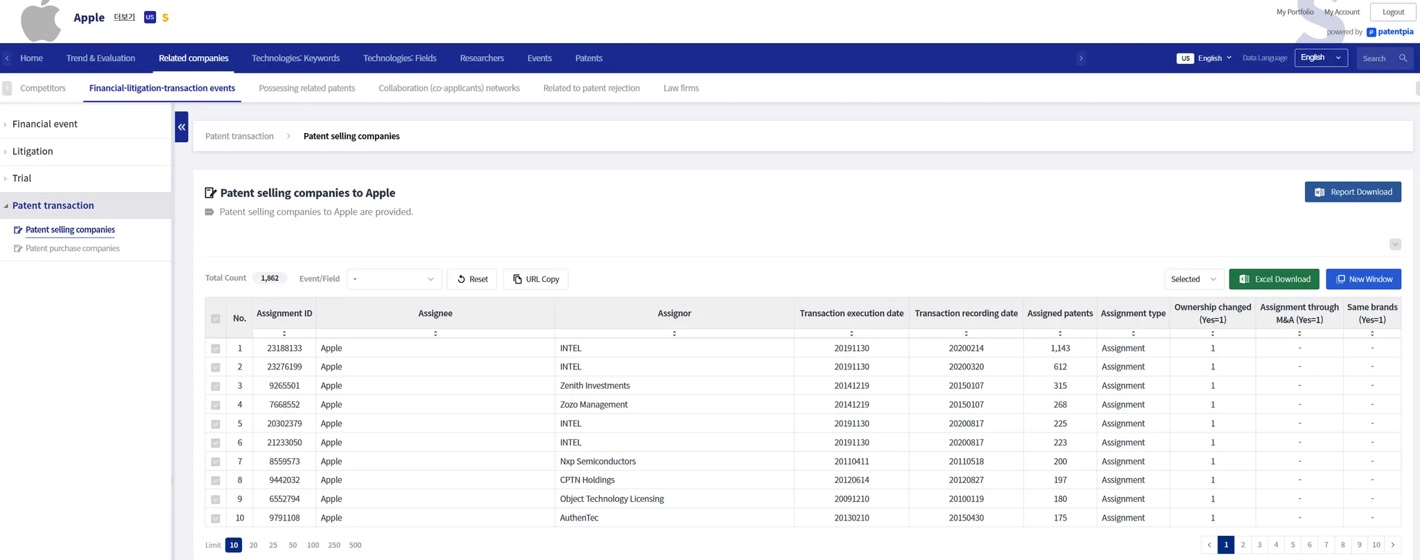Through the PatentPia Search service, you can search for events. By entering special search criteria in Search, you can get search results for high strategic value behavior. For example, in Search → Litigation Search, if you enter "Apple" in the "Plaintiff" field, Search will return a list of recent lawsuits filed by "Apple" as a plaintiff.
