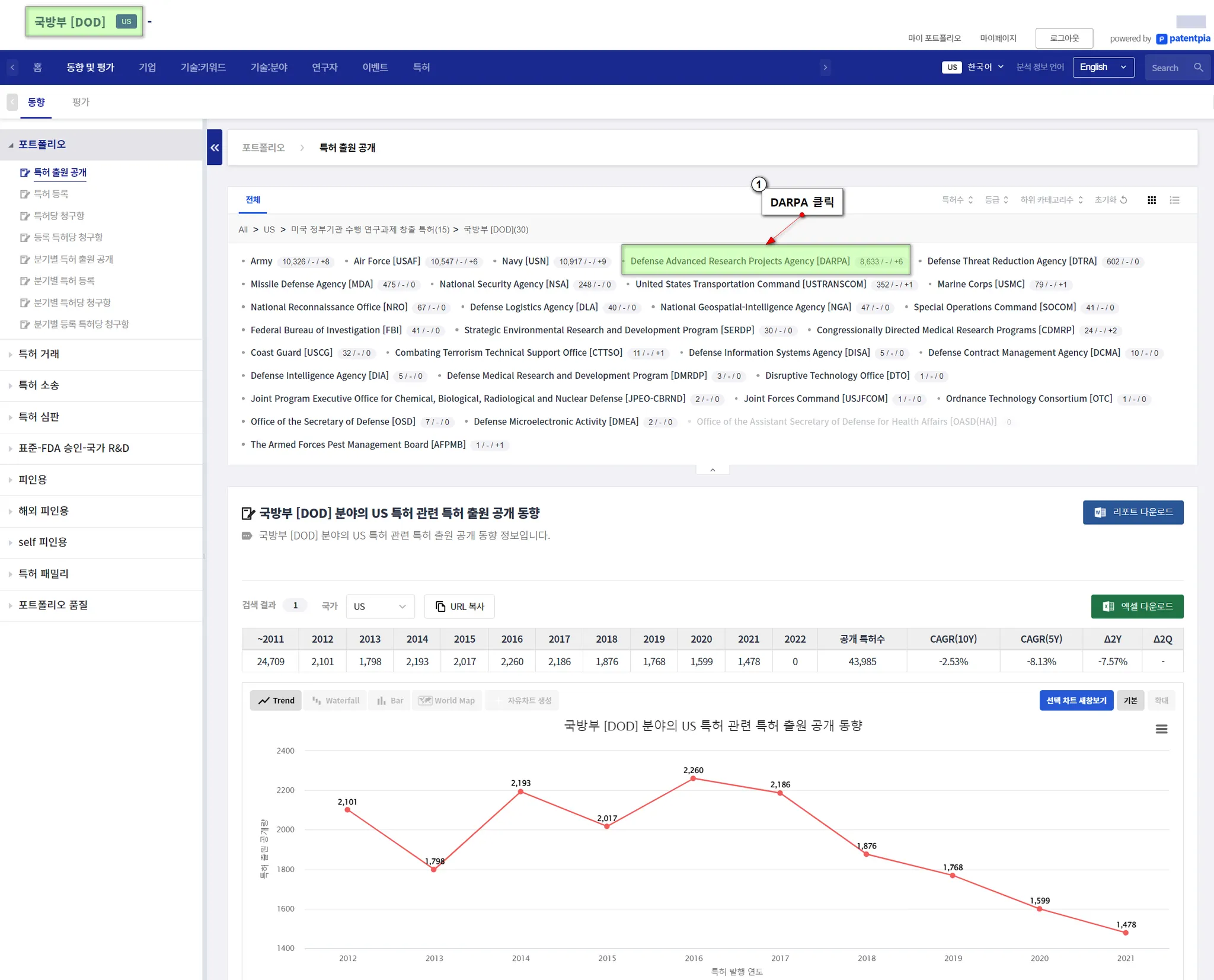 DARPA는 ’미국 정부기관 수행 연구과제 창출 특허’ 화면에서, 국방부[DOD]를 클릭하시면, DARPA가 포함된 국방부 산하 기관 리스트가 나오며, 여기서 DARPA를 클릭하면 됩니다.