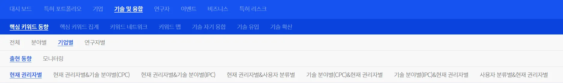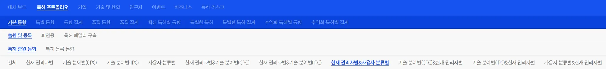 모든 메뉴 체계의 가장 아래인 5 depth에는 i) 전체, ii) 권리자별, iii) 기술 분야별(CPC/IPC), iv) 사용자 분류별(입력 특허셋에 사용자 분류가 있을 경우에만 나타남)과 같은 5 depth 메뉴가 공통적으로 존재합니다. 그리고, 복합 5 depth 메뉴인 i) 권리자별&기술 분류별 및 ii) 권리자별&사용자 분류별(입력 특허셋에 사용자 분류가 있을 경우에만 나타남)도 나타납니다. 경우에 따라서, i) 국가별 비교 메뉴가 나타나기도 합니다.