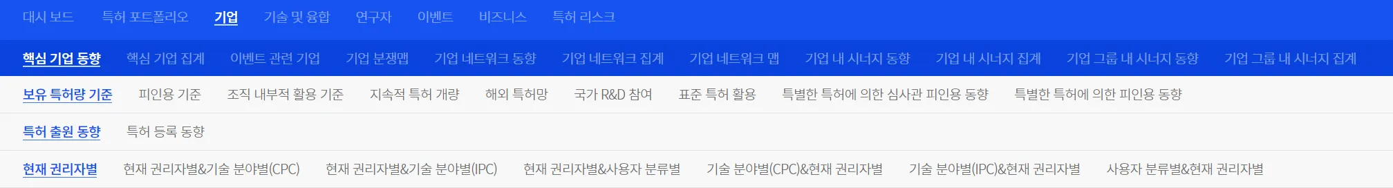 “기업” 대메뉴는 기업을 중심으로 한 분석에 초점을 맞추고 있습니다. “기업” 대메뉴 아래에는 i) 기업별 동향 및 집계 분석, ii) 이벤트와 관련된 기업 분석, iii)기업을 중심으로 한 기업-연구자-그룹 계열사 간의 네트워크 및 시너지 분석 등이 있습니다.