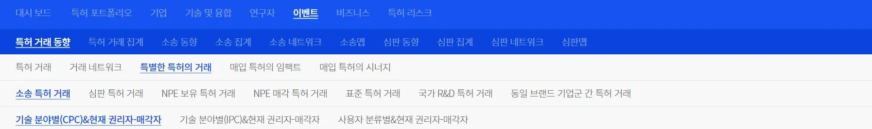 “이벤트” 대메뉴는 특허와 관련된 이벤트를 중심으로 한 분석에 초점을 맞추고 있습니다. 이벤트에는 i) 거래/매입/M&A를 통한 특허 이전, ii) 소송, iii) 심판 등이 있습니다.