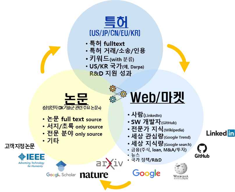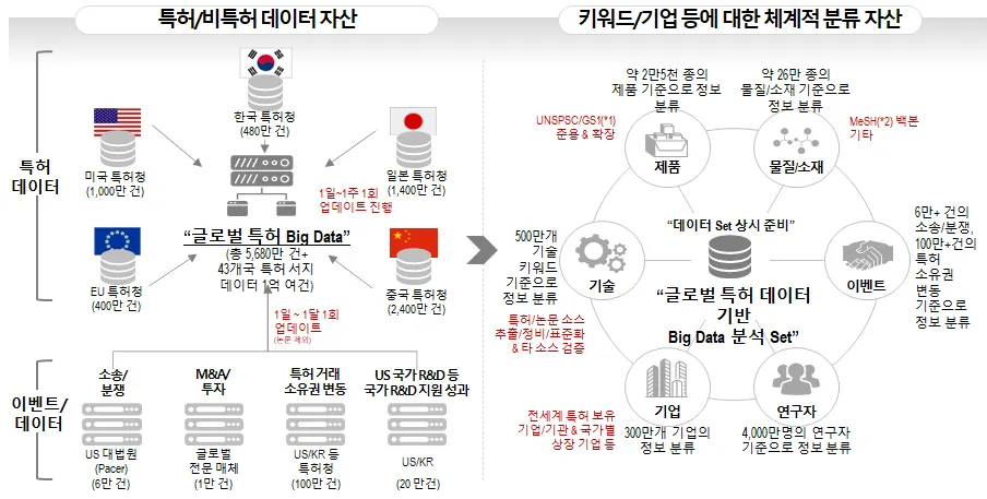 PatentPia가 보유하고 있는 대표적인 데이터 자산에는 i) 특허/비특허 데이터 자산, ii) 키워드/기업 등에 대한 분류 자산이 있습니다.