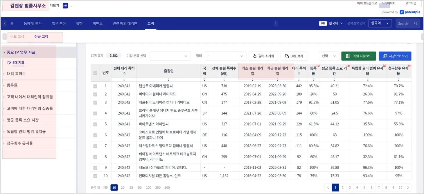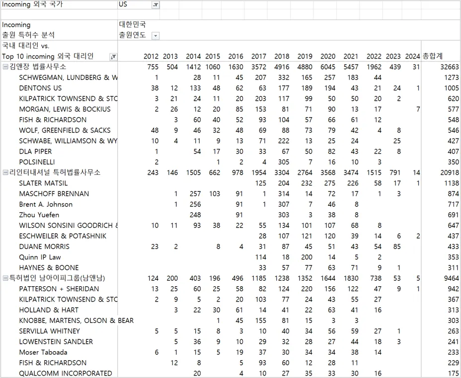 김앤장에서 떨어져 나간 고객들 분석 : 표에서 최근 출원 대리일이 2022~2024가 아닌 것들(예, 2020 등)。 최근 출원일이 2020이라는 것은 최근에는 김앤장을 대리인으로 하지 않는다는 의미임. 대리 동향에서, 김앤장의 업무를 줄이는 고객들도 동일 취지임.
