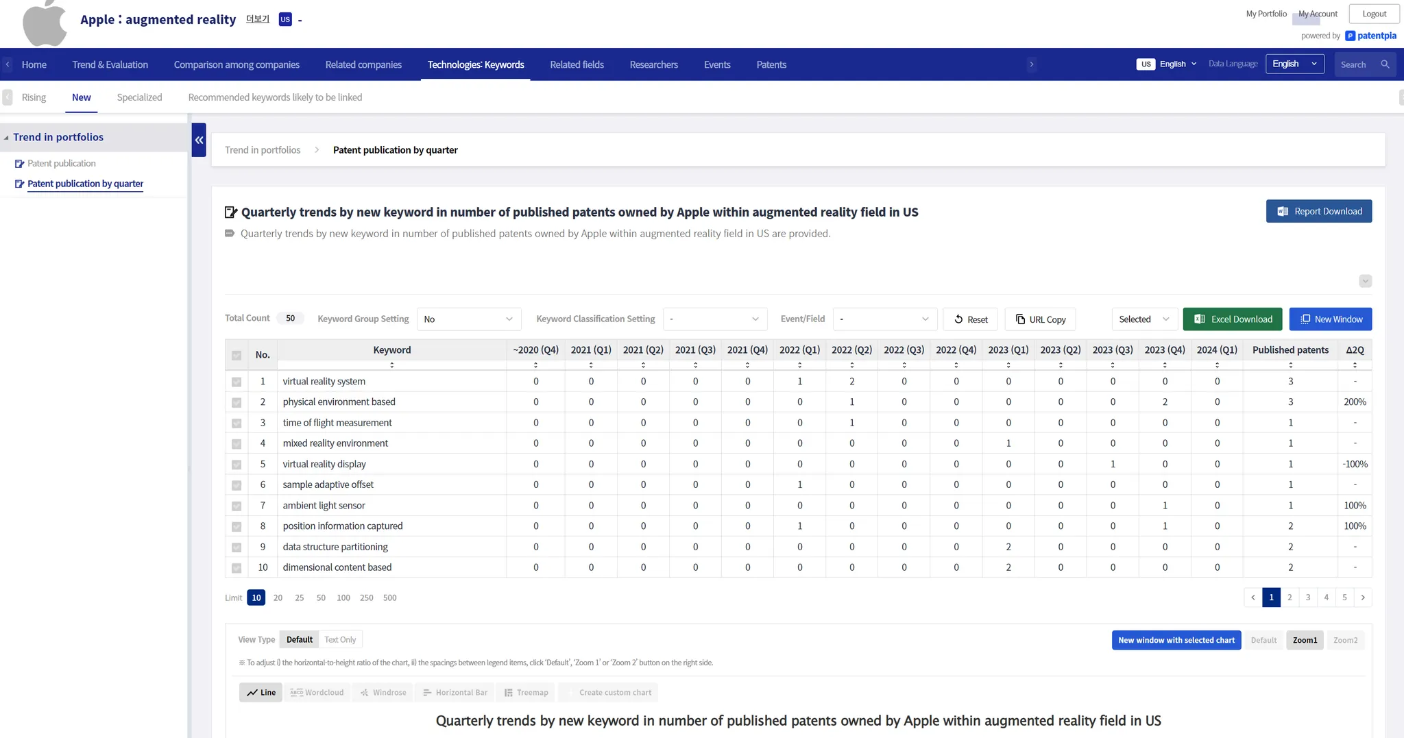 The example below is a technology convergence analysis content for keywords that co-occur in patents related to field "augmented reality" from "Apple". By utilizing co-keywords of a particular keyword, you can also discover areas of convergence, utilization, application, or applicability with that particular keyword.