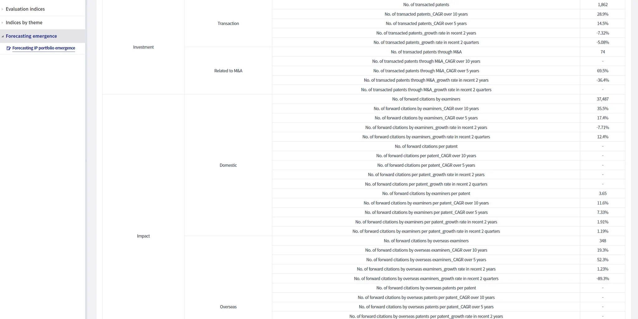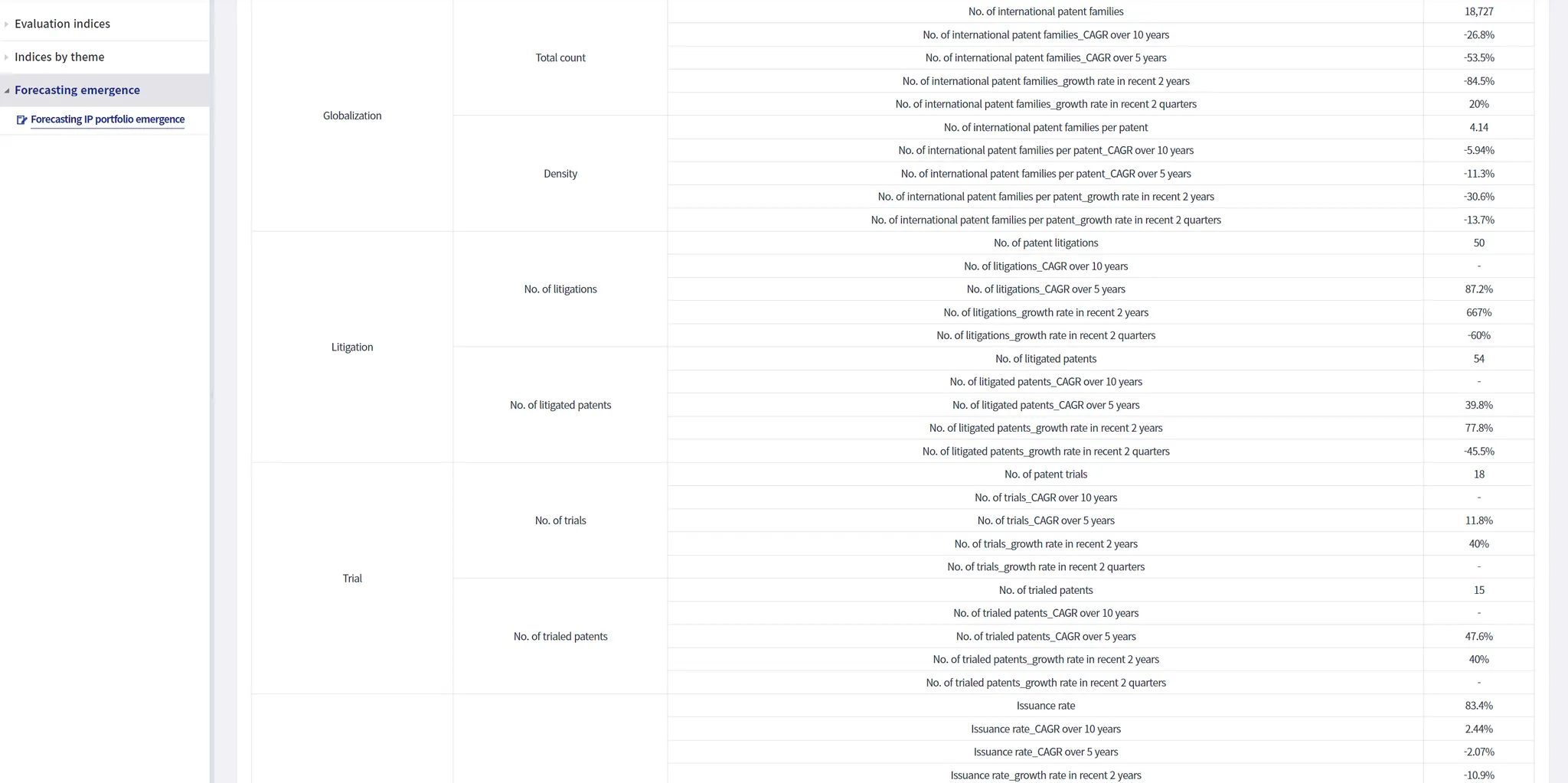 Prediction information is located at the top of the web page for its own (input/selected) item. The forecast rationale information is provided by selecting the Trend & Evaluation large menu→Evaluation mid-menu→Forecasting Evaluation sub-menu→Forecasting IP portfolio emergence detailed menu for the own (selected/input) item.