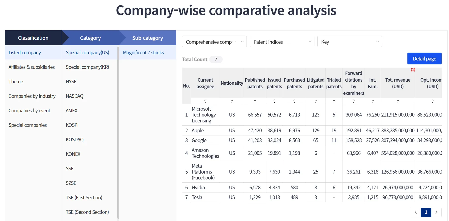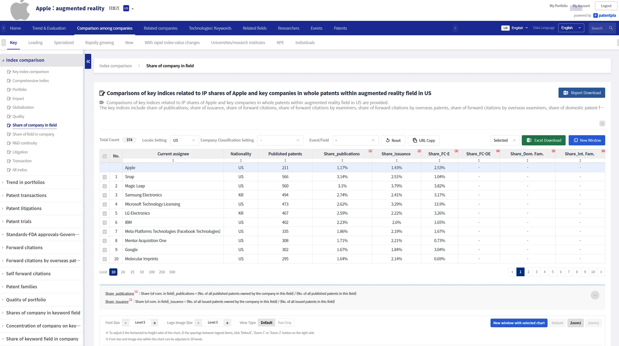 There are two types of comparisons with companies: i) a given set of companies provided by PatentPia and others, and ii) a customized set of companies uploaded by users.