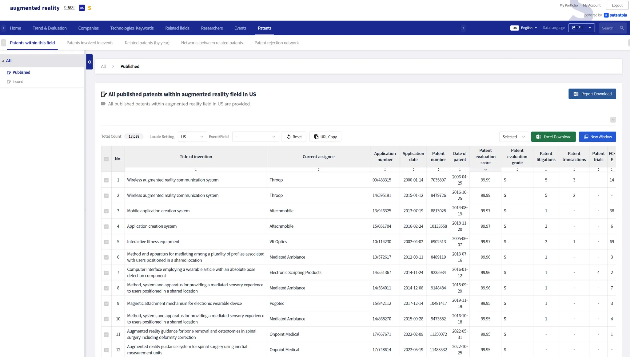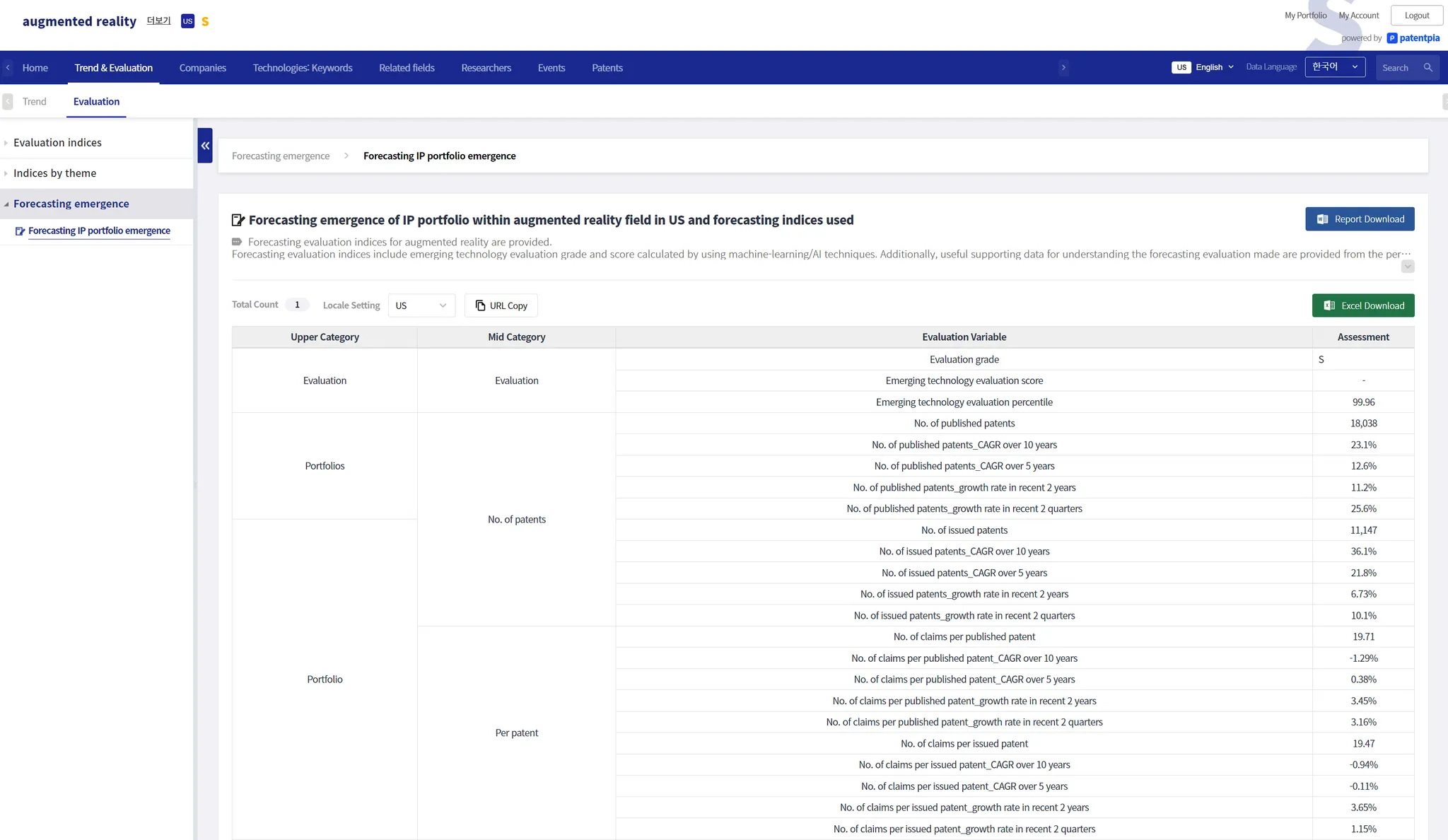 The example below is a page showing the evaluation score and evaluation grade for patents related to the keyword item "augmented reality".