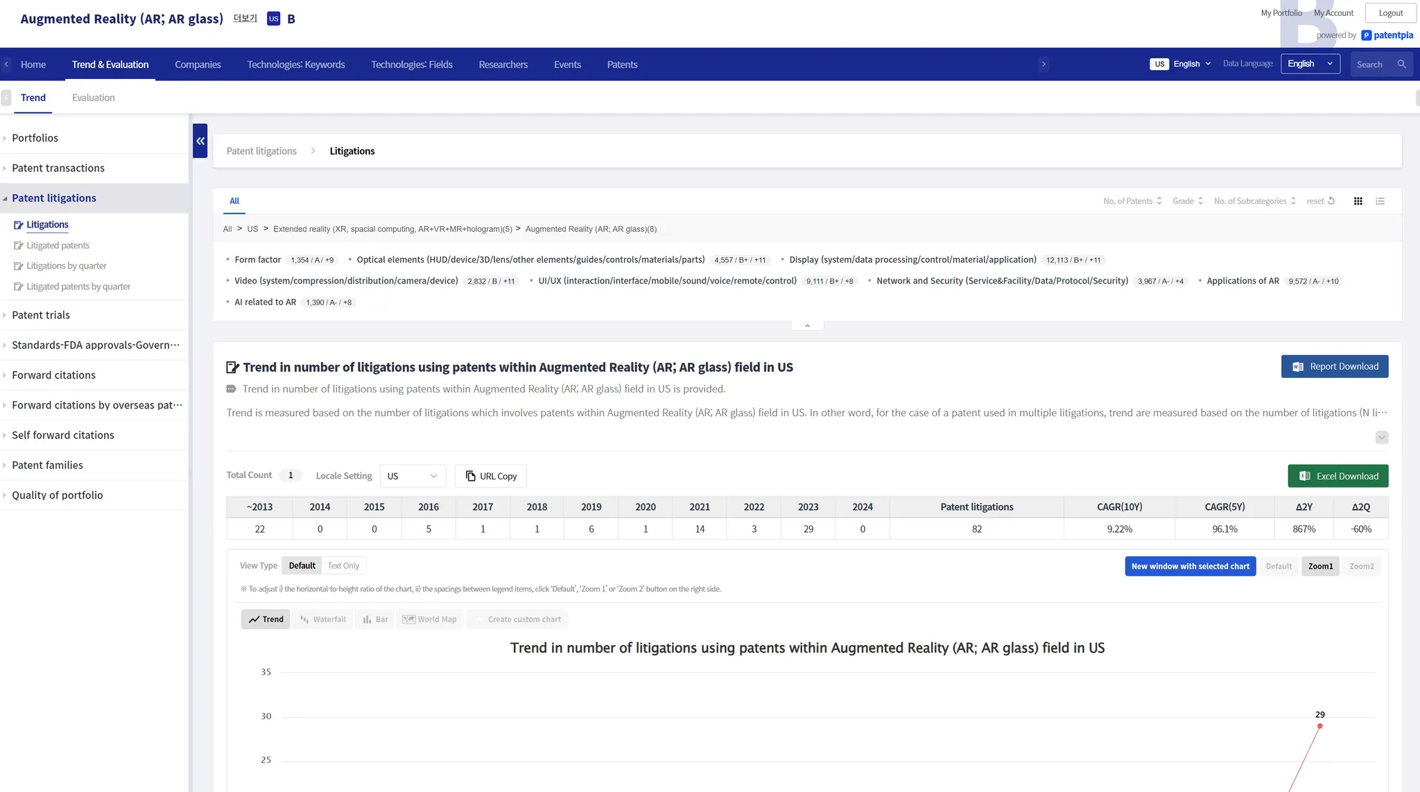 Below is the analysis contents of the trend of No. of litigations during events for the technical field "Augmented Reality (AR; AR glass)" itself (input/selected item).