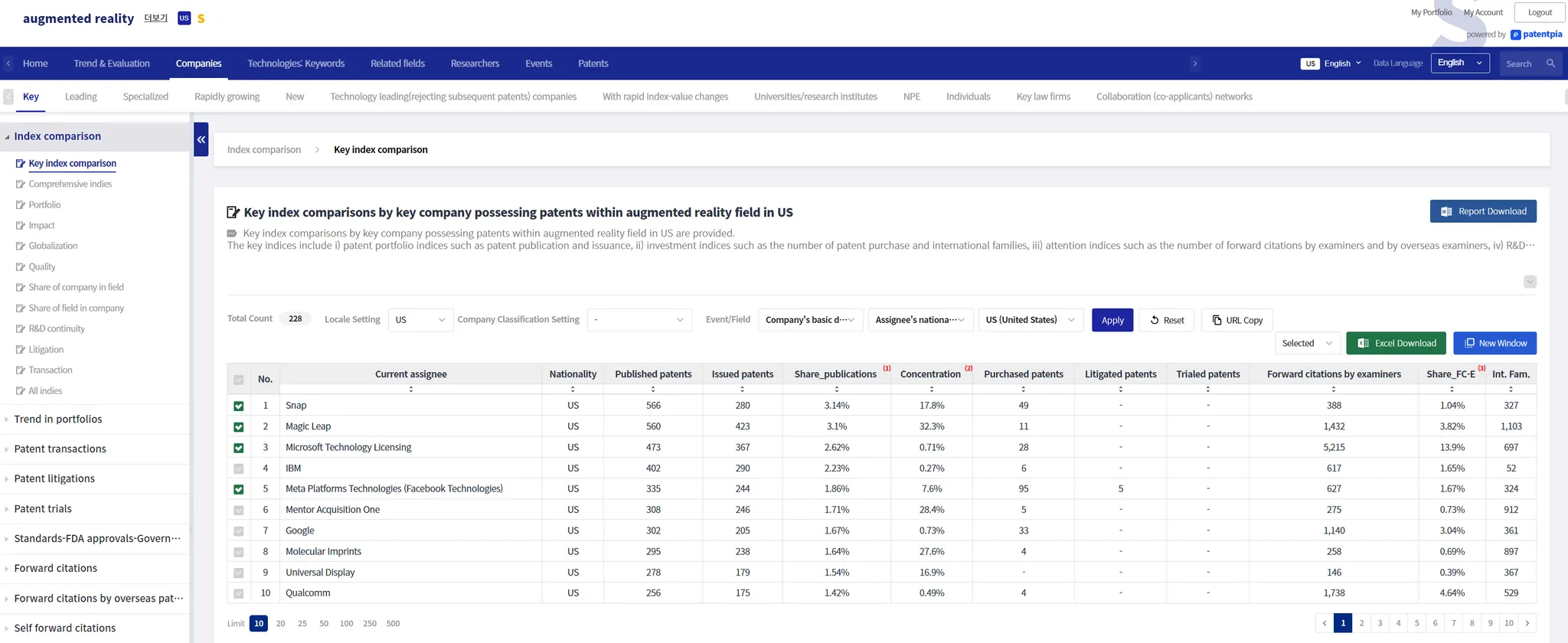 Items can be single items such as "company" (e.g., Apple), "keywords" (e.g., augmented reality), "technology classification", "patent classification", "researchers", and composite items that combine two single items (e.g., Apple's augmented reality).