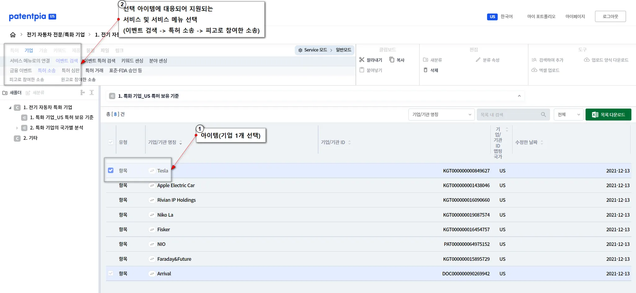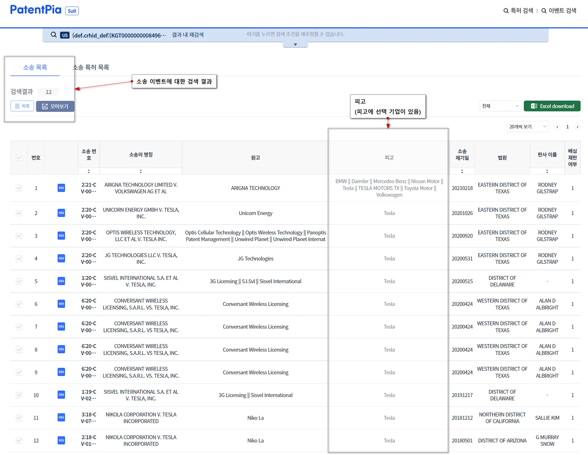 My Platform에서 위와 같은 행위를 하면, PatentPia Search는 주어진 조건(피고 = Tesla)을 사용한 "이벤트 검색" → "소송 이벤트 검색"에 대한 결과 콘텐츠를 제공합니다.