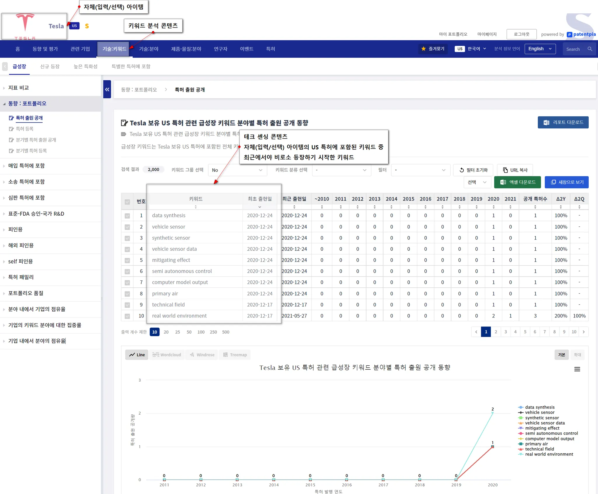 아래 예시는 선택 기업의 US 특허에 포함된 급성장 키워드 중 최근 특허에서야 비로소 등장하기 시작하는 키워드를 분석하는 테크 센싱 콘텐츠입니다.