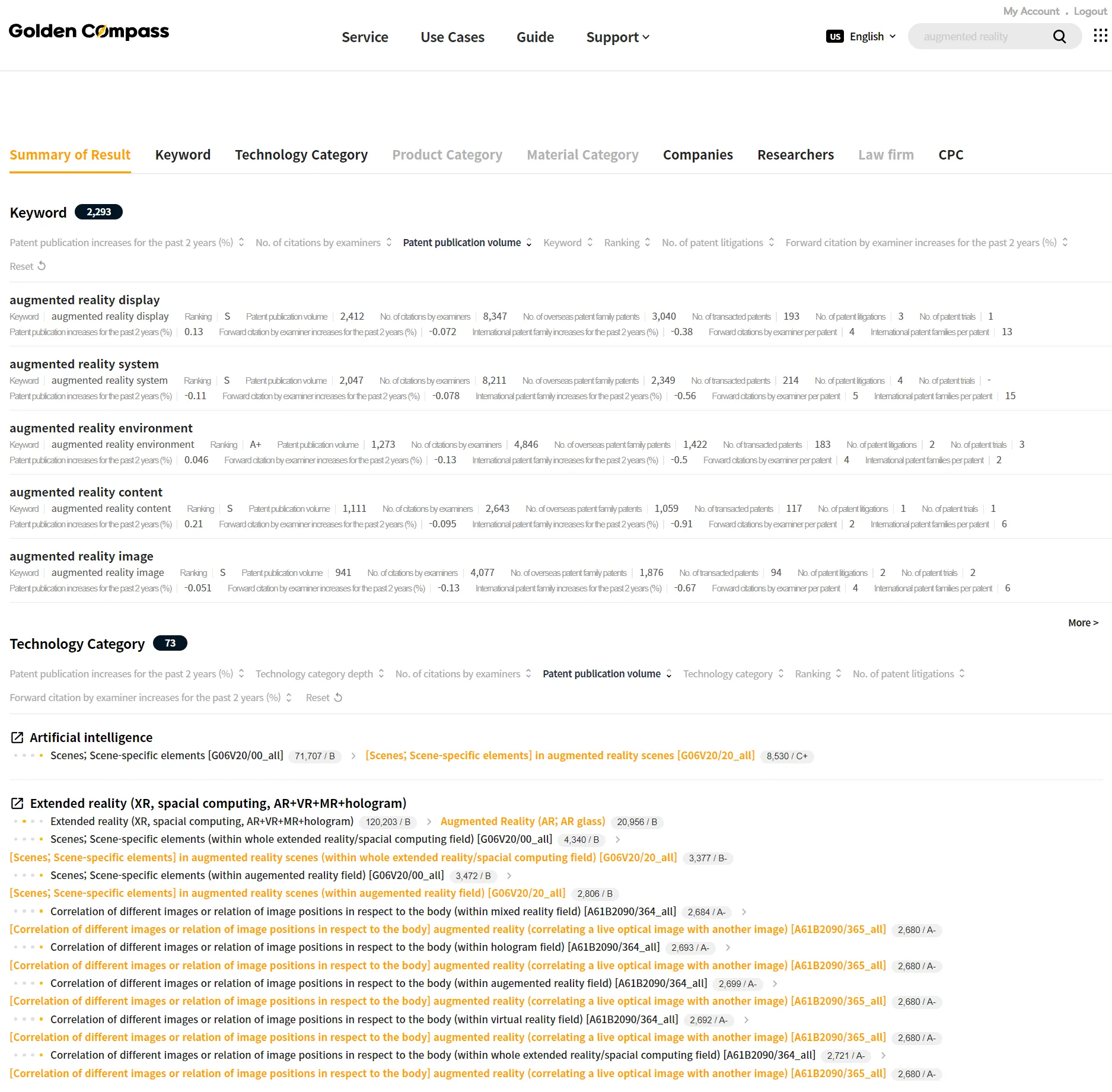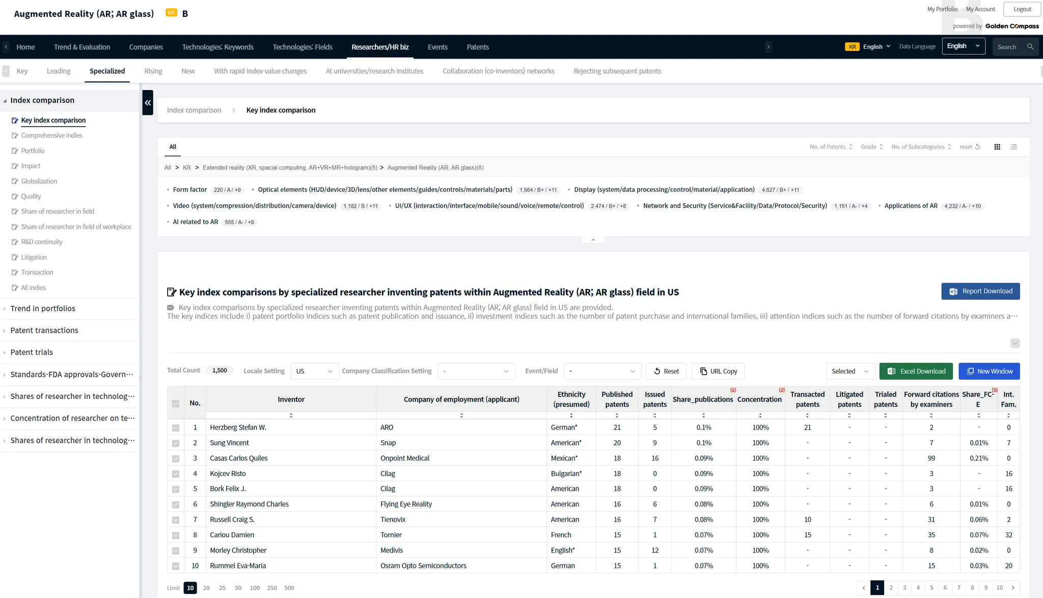 For an example of a technology field, below is a GoldenCompass page for United States’ specialized researchers who are focused on augmented reality (AR).