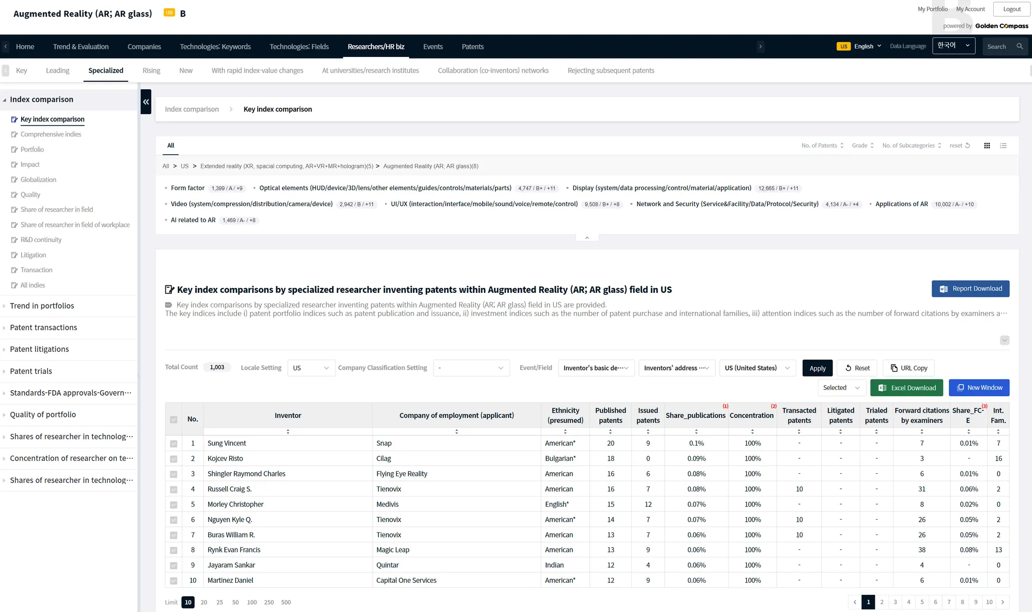 The example below is a GoldenCompass page for specialized researchers who invented patents related to field in korea, focusing on augmented reality (AR).