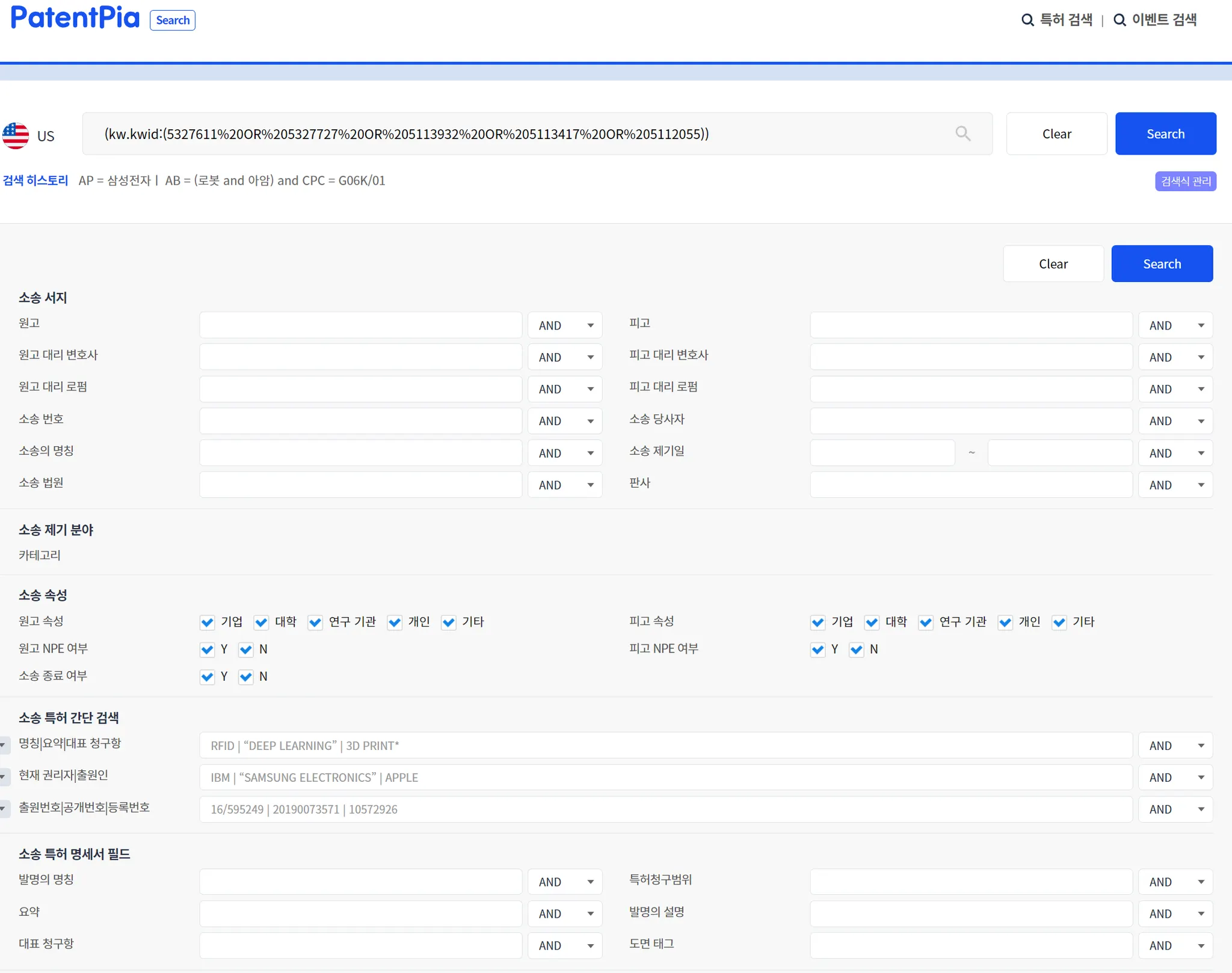 물론, PatentPia Search에서는 다양한 검색 조건을 부가할 수 있습니다.  위 화면에서 상단 영역에 있는 역삼각형 아이콘을 클릭하면, 검색 조건이 입력된 다음과 같은 화면이 나타납니다.