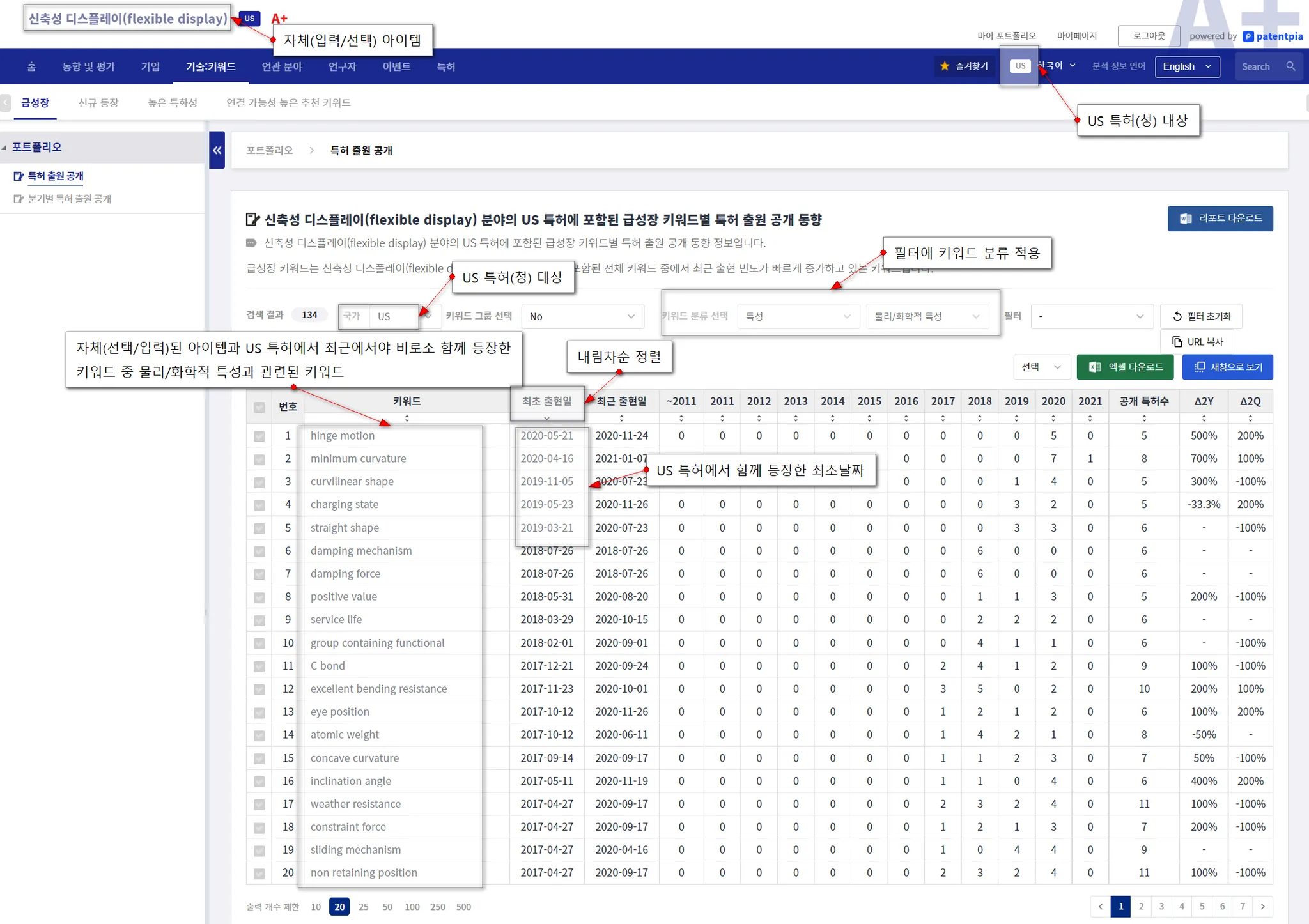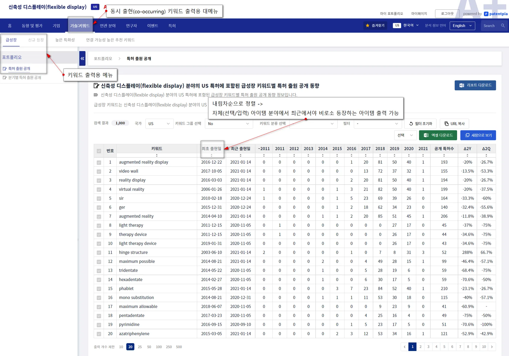 키워드 분석 화면 등에서는 "최초 출현일"이나 "최근 출현일"이 나타납니다. "최초 출현일"을 역순으로 선택하면, 가장 최근에서야 비로소 등장하는 키워드 등의 아이템이 나타납니다. 키워드 분석 화면에 이 소팅을 적용하면, 원 클릭만으로 테크 센싱 결과를 획득할 수 있습니다.