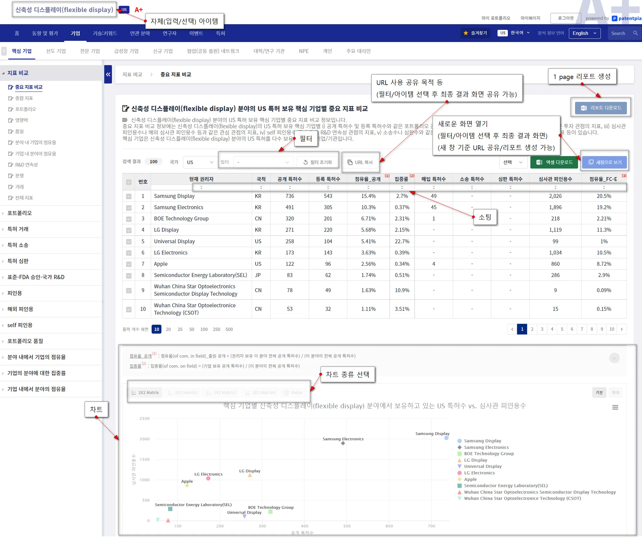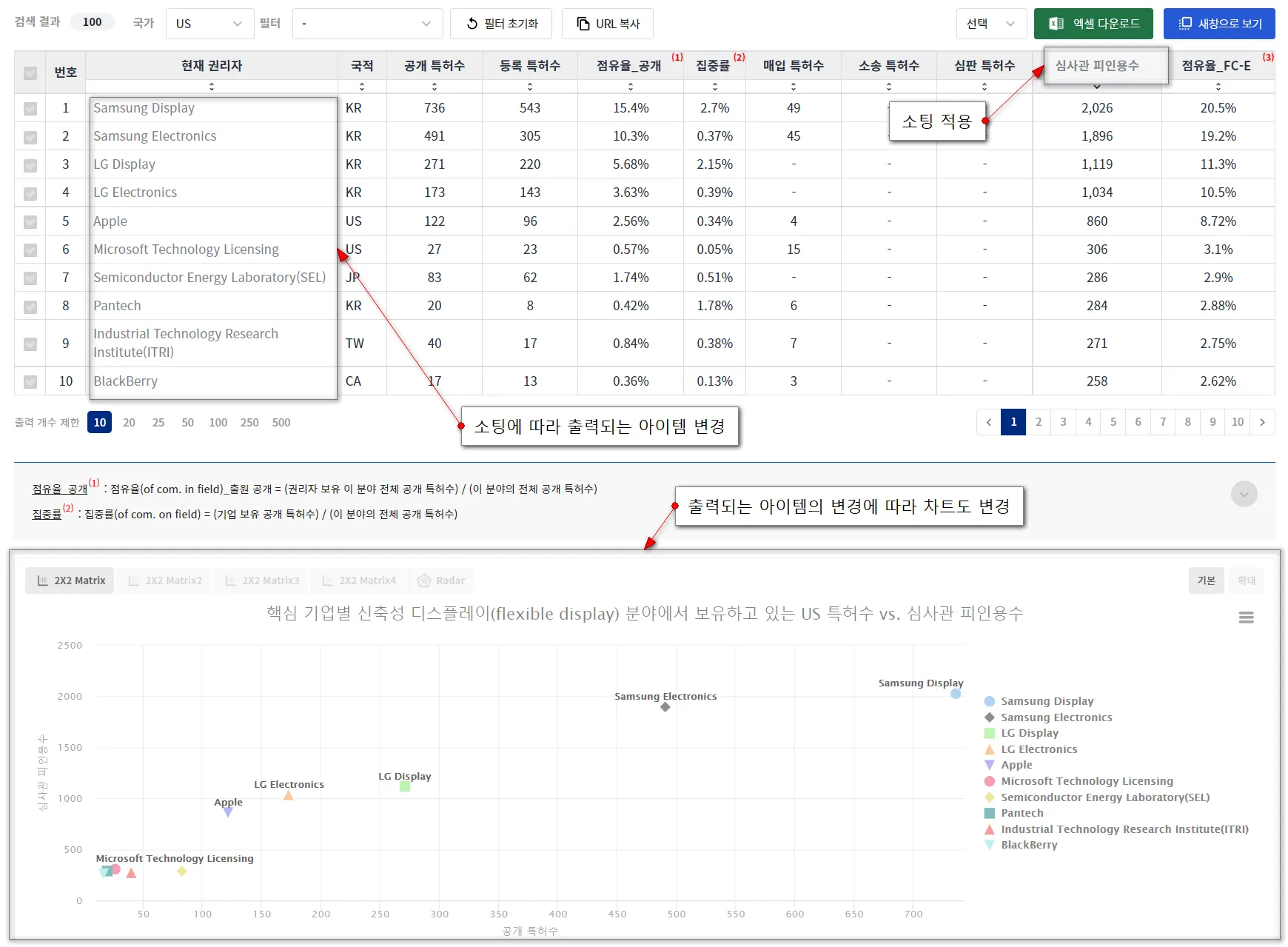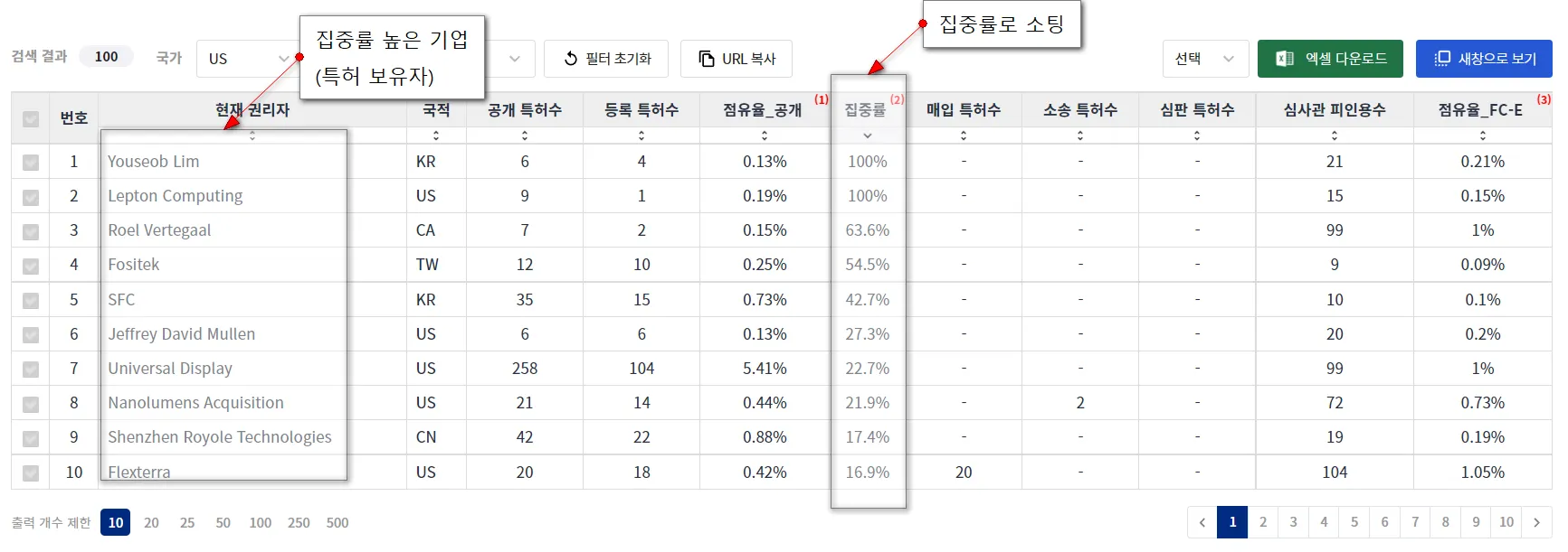 예를 들어, "집중률" 필드를 기준으로 내림차순 소팅하면, 집중률이 높은 기업이 나타납니다. 집중률이 높은 기업이란, 특정 기업이 보유하고 있는 특정 국가의 전체 특허 중에서 특정 분야(여기서는 "flexible display") 특허의 비중이 높은 기업입니다. 즉, 이 분야에 집중하고 있어, 전문성이 높은 기업일 가능성(특히, 보유 전체 특허수도 많고, 과거부터 꾸준하게 특허를 축적해 왔다면) 이 높습니다.