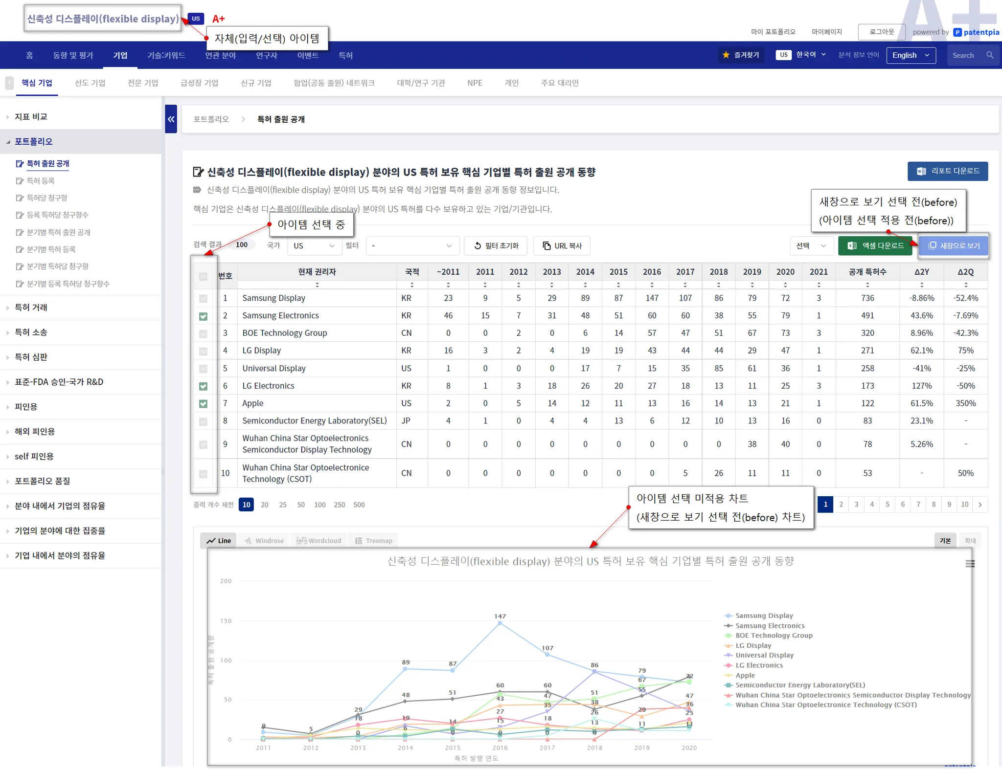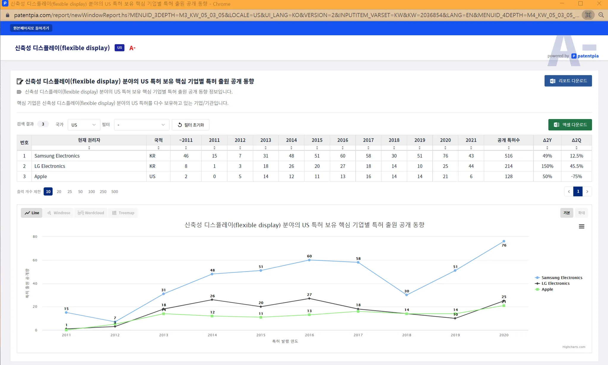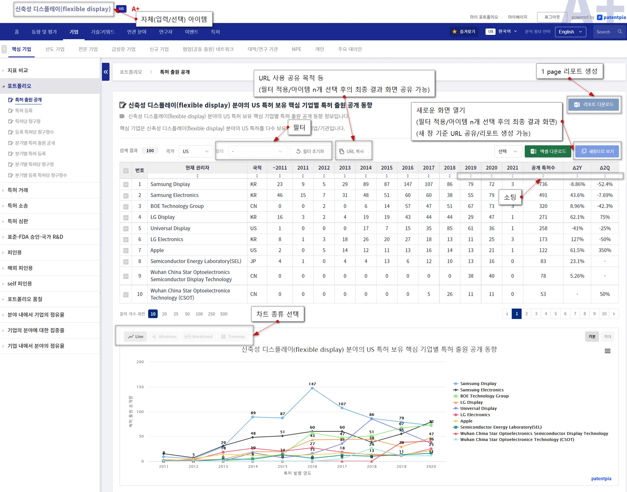예를 들어, "집중률" 필드를 기준으로 내림차순 소팅하면, 집중률이 높은 기업이 나타납니다. 집중률이 높은 기업이란, 특정 기업이 보유하고 있는 특정 국가의 전체 특허 중에서 특정 분야(여기서는 "flexible display") 특허의 비중이 높은 기업입니다. 즉, 이 분야에 집중하고 있어, 전문성이 높은 기업일 가능성(특히, 보유 전체 특허수도 많고, 과거부터 꾸준하게 특허를 축적해 왔다면) 이 높습니다.