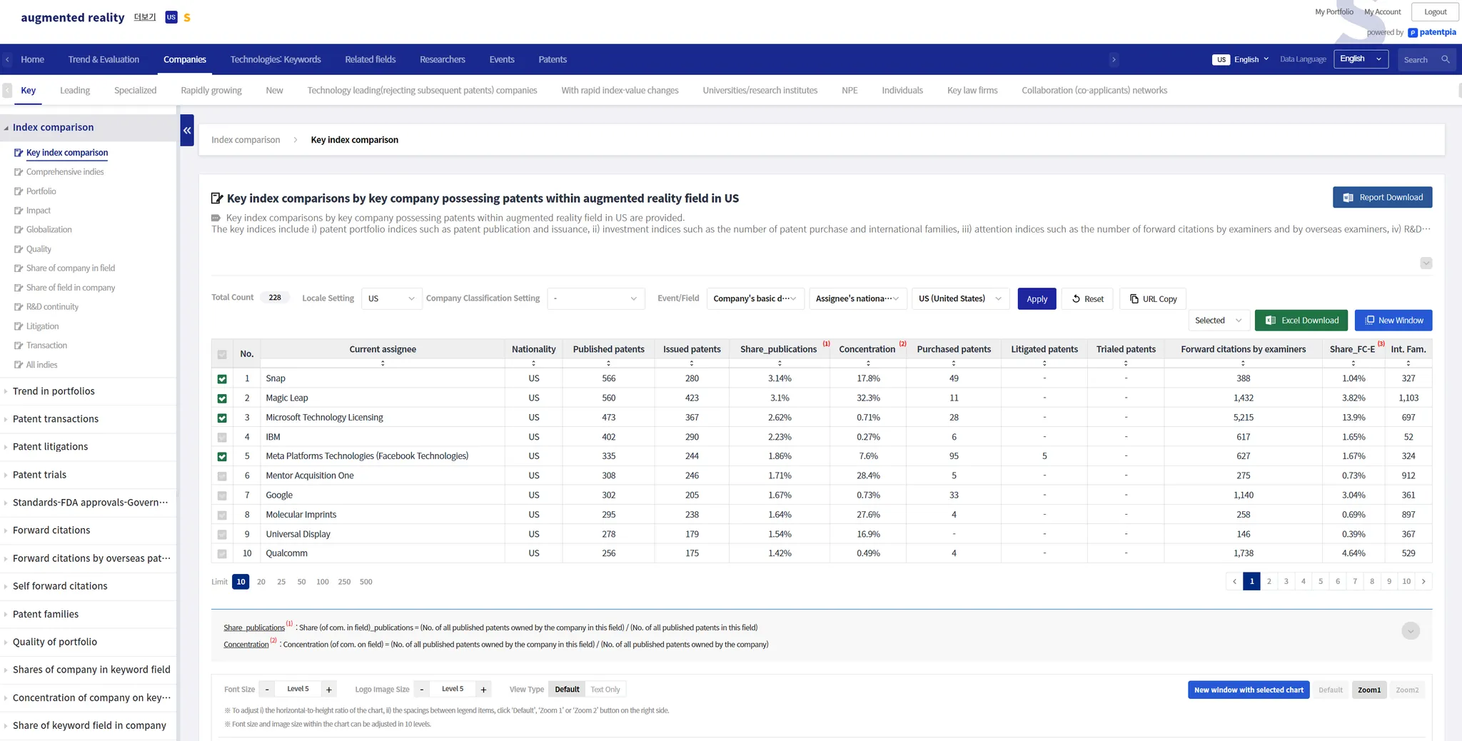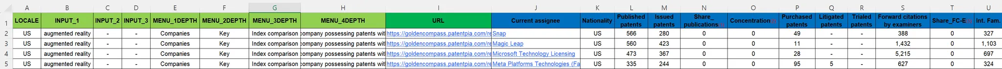 The contents of the excel file are given various links. The links include i) mandatory links (colored green above (URL column)) that are connected to the analysis result page where the download was executed, and ii) links to individual items (e.g., companies/keywords, etc.) that are included in the analysis result page, such as the links given in the current right holder column above. When you click on a link, you are connected to the analysis result page. The analysis result page provided when a link is clicked will also open (without a separate login) for users who do not have the right to the account.(coming soon)
